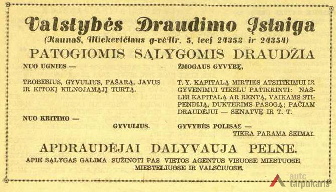 State Insurance Institution was part of the densely built-up section of A. Mickevičius Street in the thirties, between current Karalius Mindaugas Avenue (then Uosto Kranto Street) and Miškas Street. In 1933 it saw the opening of the Faculty of Medicine of VMU, almost at the same time on the adjacent plot – the opening of the State Insurance Company, and several years later on the other side of the street – Health Insurance Fund. Hence, a quite significant complex of simultaneous buildings formed at the side of the New Town, which, it is believed, became a distinctive hub.