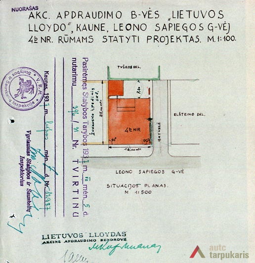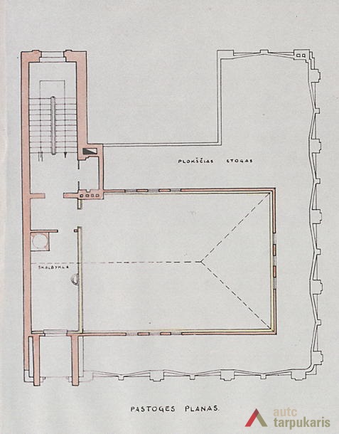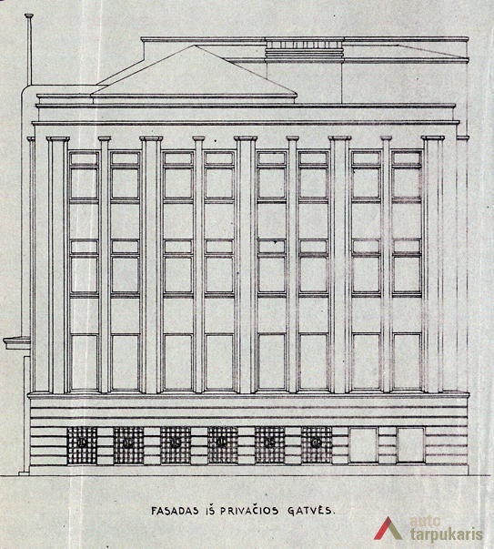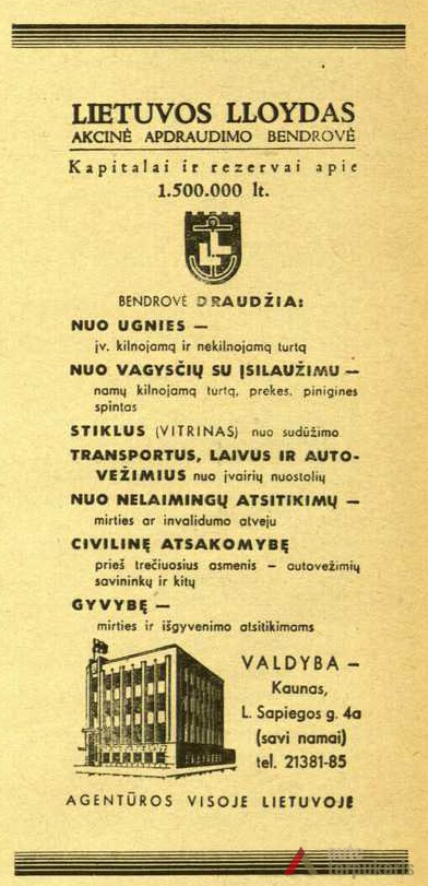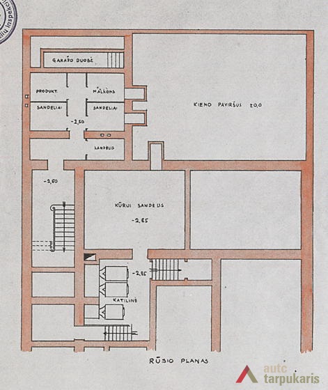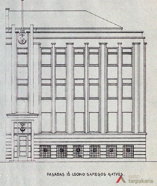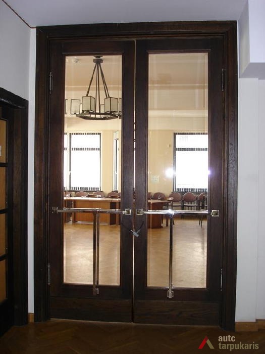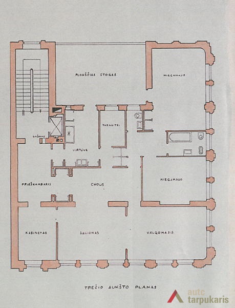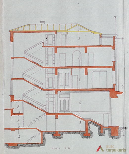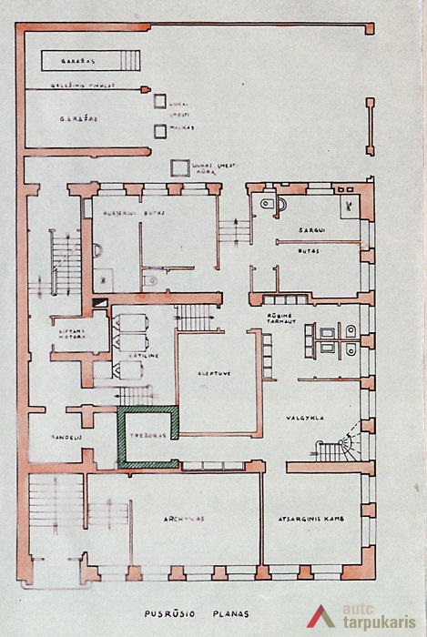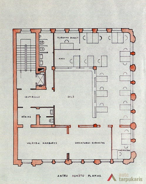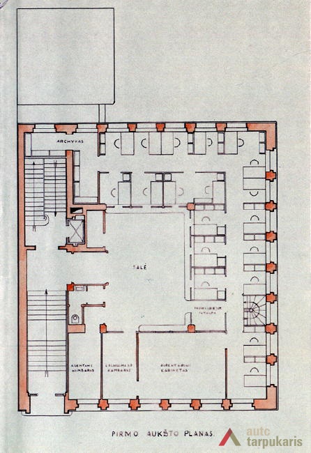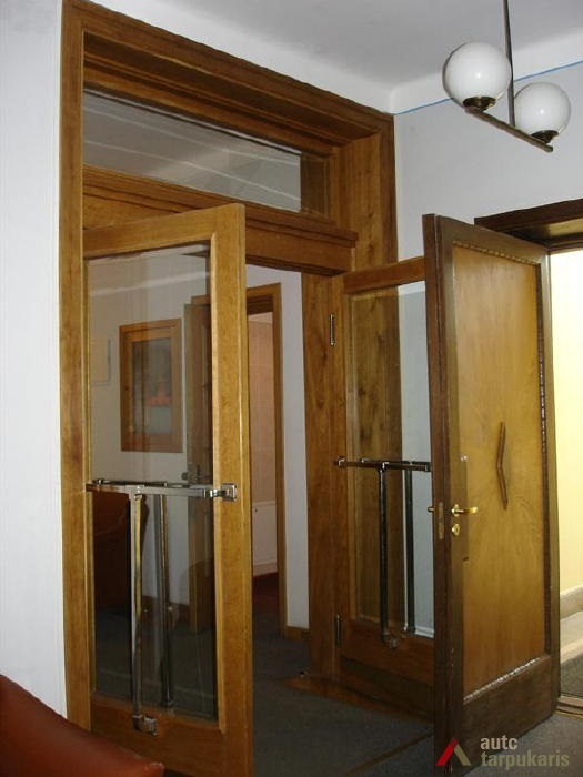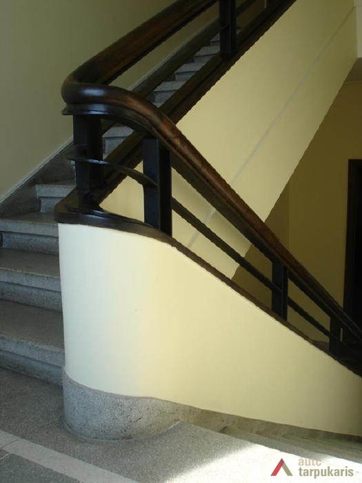 Although built at the end of the thirties with rapid architectural modernisation processes underway, Lloyds office retains the monumentality and the classic tectonics characteristic of Kaunas architecture at that time. However, it is interesting to note the layout of the first and the second floors – the premises are not separated by load-bearing walls. The hall, employee desks and the director’s office are separated by light partitions. It is a quite modern solution. The third floor was designed as a very luxurious residential apartment with two bedrooms, a maid’s room and a roof platform. The basement was to fit in various facilities: a canteen, apartments for the janitor and the courier, an archive, a hideout and other smaller facilities. The interior still contains quite a few authentic details (one of them can be seen on the outside – a window with Lloyd company’s symbolism).