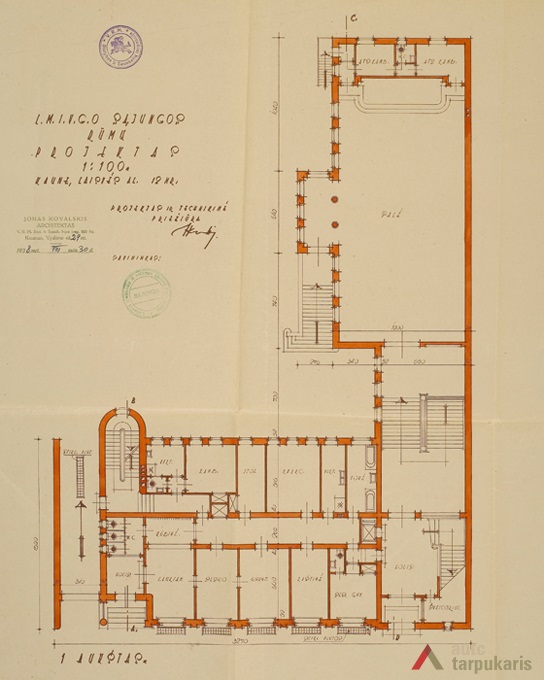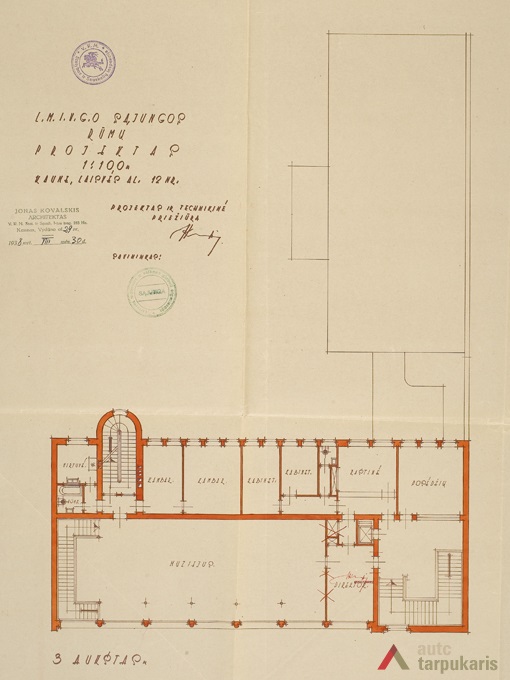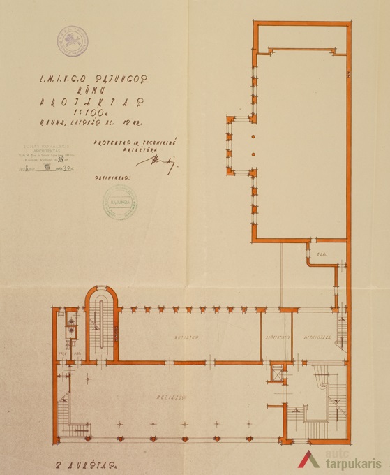 The museum was free of charge and well-known. It is inevitable that quickly expanding activities forced to look for a new space. Therefore, the organisation bought a nearby piece of land and announced a tender for the construction of a new building for the museum and the association. The tender was won by architect Jonas Kovalskis-Kova who had just finished his studies in France several years ago. As evidenced by the remaining draft, it could have been one of the most modern buildings of the temporary capital. Strip windows, minimalist facade emphasising building’s materiality – all that indicated a new concept of architectural representation. Joints between face panels were decorated with symbolic toy figures of horses and birds. The main entrance was just as fancy, as it was decorated by a sculpture of a mother and children. Nevertheless, if we put this building against another object of a similar period performing a social function, such as the retirement home, this project was clearly focused on the pure aesthetics of international modernism.