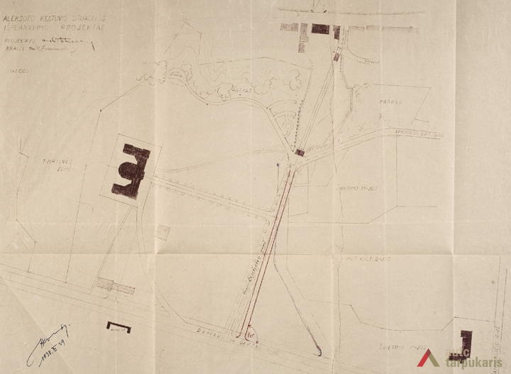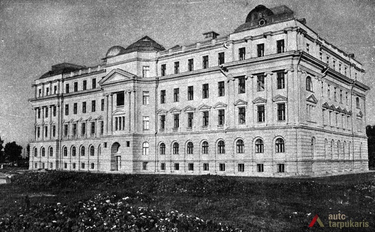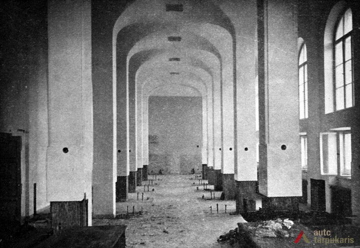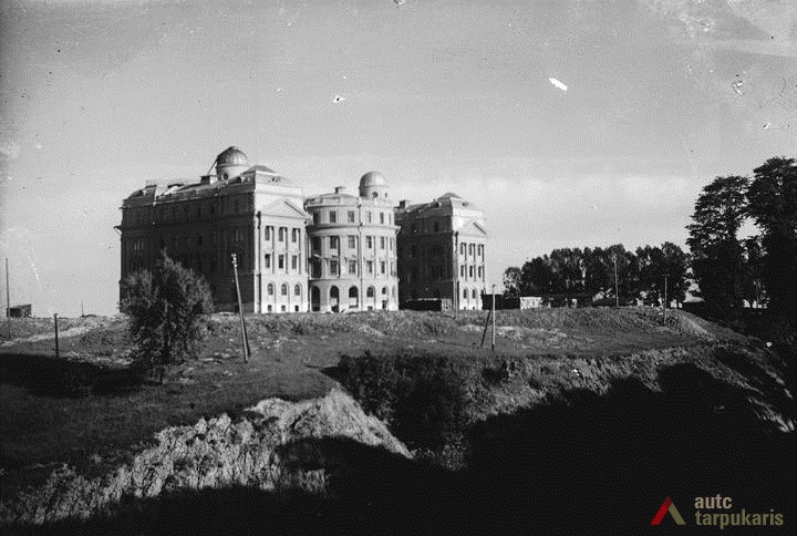 The construction, which cost 2.5 million litas, took unusually long to complete – seven years – during which, according to architect M. Songaila, “more than 300 drawings and estimates were produced”. The cornerstone was consecrated back in 1925, whereas the institution was only opened for the academic year of 1931. The interior took even longer to complete. The building was consecrated on 15 February 1932. Hence, at the beginning of the thirties Kaunas was enriched by a very expressive building which expanded city’s architectural scope not only geographically, but also functionally. At the end of WWII the building was blown up.