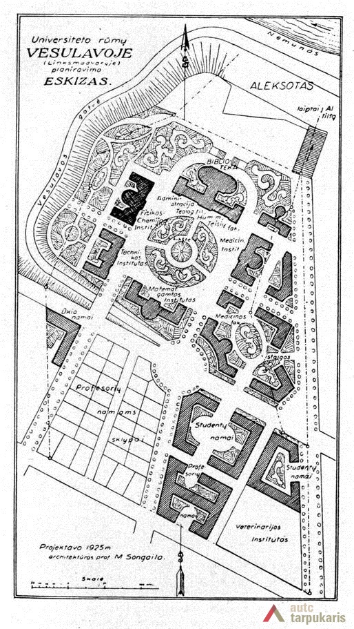 The idea to build the university building came right after regaining independence. The newly built university in the temporary capital lacked facilities, which is why in 1924 an international tender for the construction of a new campus building was announced. Although the tender was international, the first grant (8000 litas) was awarded to Finnish architect Y. Waskinen, the second one was given to his fellow countryman P. Blomstedt, the third – to two German architects; the design was awarded to Vytautas Magnus University professor Mykolas Songaila. “When preparing the draft, it was based on the first grant winner’s idea”, however, Songaila transformed the architecture into a classic example of historicism of the beginning of XX century. Actually, the professor had not only aesthetic, but also educational ideas in mind: “In spite of modernist trend prevailing at that time, facades were designed in Renaissance style, since Kaunas, especially as a province, had no consistent style of buildings, with the exception of churches, the town hall and 2–3 private residential houses, to be able to introduce university students to real life examples of classical forms”.