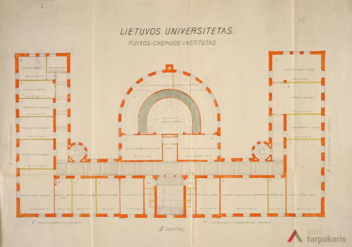 Institute of Physics and Chemistry of Vytautas Magnus University is an exceptional object in Lithuanian interwar architecture. Its size, its monumental composition and its imposing appearance allowed it to compete with the buildings of Lithuanian Bank and, or even the Church of Resurrection. Visible from almost anywhere around Kaunas, the building was a notable architectural landmark on the left shore of Nemunas, indicating that the other side of the river was gradually becoming an integral part of the city.