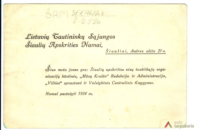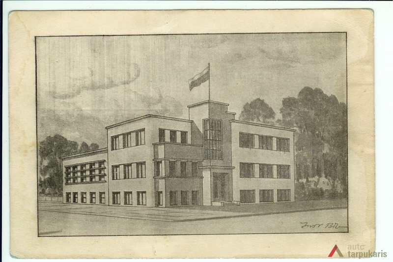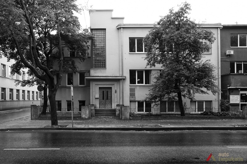 Even amongst the modern building of this part of Aušra alley, the House of the Nationals stands out due to its live playfulness of asymmetric volumes. Exceptional accent – corner of a glassed staircase above the main entrance, at the top ending with a long staircase wall. The building hosted the editorial office of “Mūsų kraštas”, Šiauliai region Nationals organization headquarters’ right wing journal, printing house of Lithuanian Nationals’ Union “Viltis”, National “central” bookstore, which was moved from Vilnius Street. Here it had a spacious, bright reading hall, separate premises for catalogues and a changing room.
