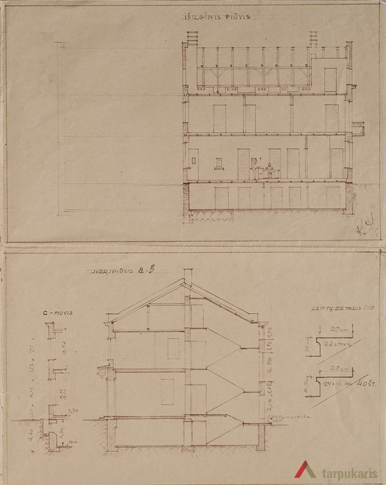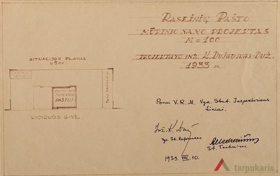 It is no wonder that the post as well did not have its own office and was located in a wooden, low-quality building. Following the moving out of Raseiniai house of arrests to a new building, in 1930 the board of the post received a plot of land with buildings located at V. Kudirkos Street. In 1933 a then drafter of the post’s board K. Duž-Dušauskas drew up a draft for a new building. The old buildings were torn down, their bricks were used for the construction of the new one. Hence, since November 1934 “Raseiniai post office workers put an end to the winter cold and the sounds of the wind which was constantly blowing through their rotten windows” and moved out to the new office. Although the draft shows that the post office was to be built over two stages, the second stage was not implemented.