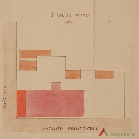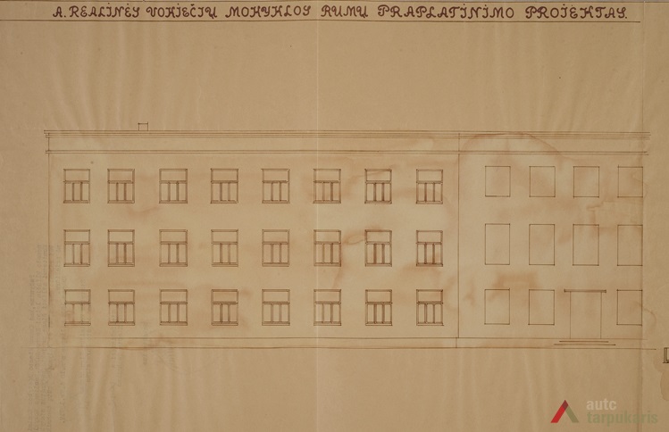 In 1922 the construction of the school building took off according to a draft by Swiss architect Eduardas Pejeris at the intersection between Vytautas Avenue and Ūkis Street (now Totoriai Street). However, the works were finished according to the draft by V. Landsbergis-Žemkalnis. The building is a characteristic example of functionalism: one of the most outstanding highlights is different-sized windows designed to let enough light in the school. Aesthetic solutions of the front face consist of a harmony between symmetry (equal arrangement of windows) and asymmetry (the main entrance built on the side; different-sized windows). Minimalist exterior allowed the massive three-story building to easily and seamlessly blend in with the urban landscape, yet avoid becoming monotonous or boring.