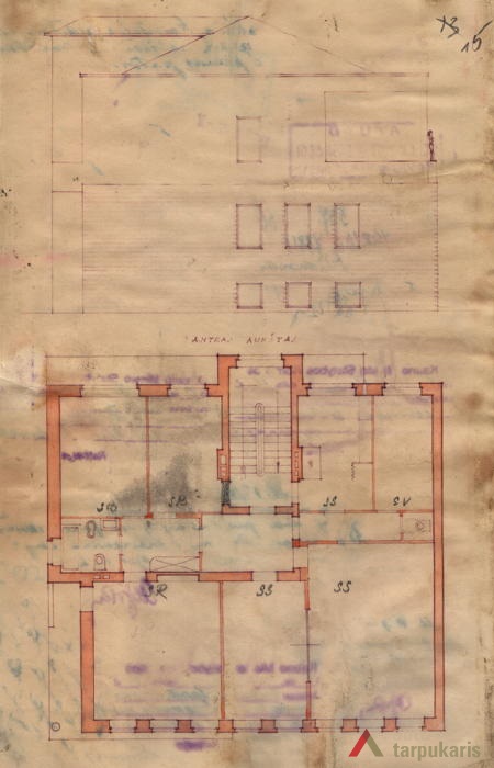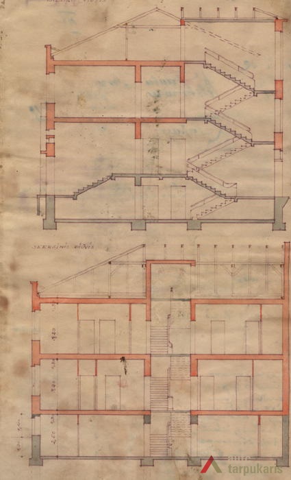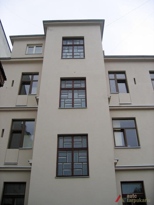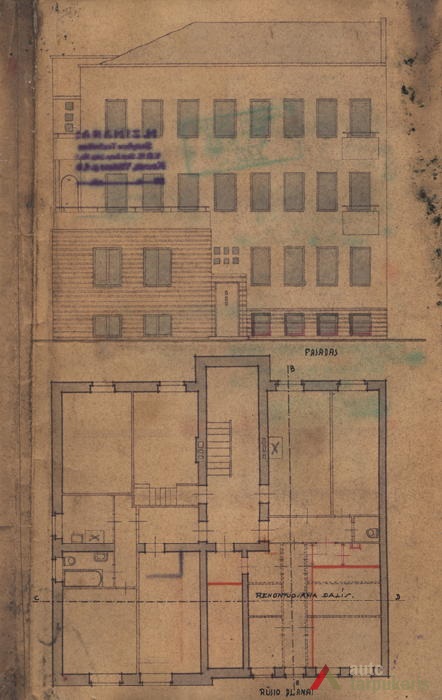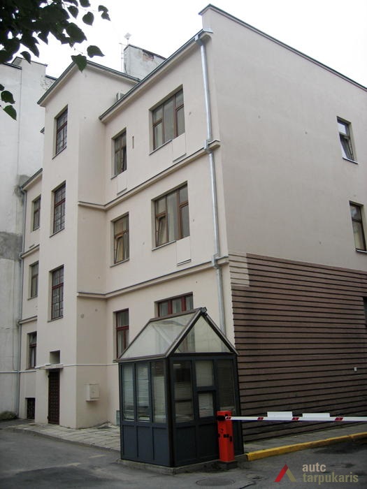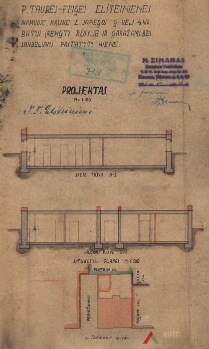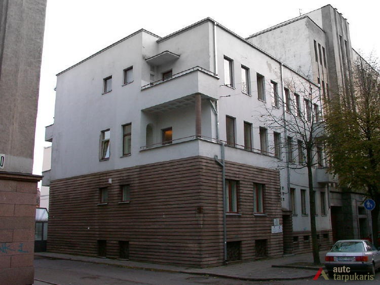 A five-apartment house owned by Taubė Elšteinienė was one of the most elegant and the most unique examples of Kaunas modernism. Although we can see characteristic elements of that in that period in the architecture (narrow, vertically lined up windows, an arch), in its style the building clearly stands out from the architectural landscape of the city. Ascetic cubic shape and symmetric facade, emphasised by the dark, horizontally stripped corner part, provides the building with a clear modernist character. The draft was supplemented in 1938 by architect M. Zimanas by designing an apartment in the basement and a garage with warehouses in the courtyard. An interesting difference is that in the first draft the house is shown as having two stories with a basement, yet in the 1938 version is shown as having three stories – just as it is today. Thanks to its unusual architecture the building was acknowledged by receiving an award for “the most beautiful facade of a residential house” from Kaunas City Council in 1935.