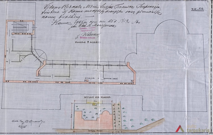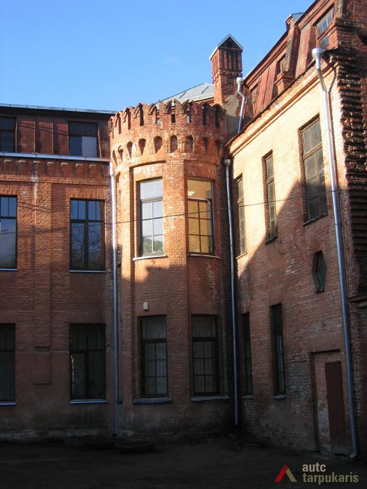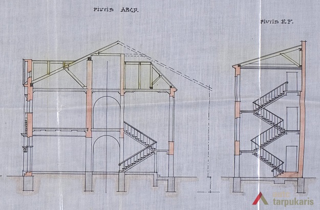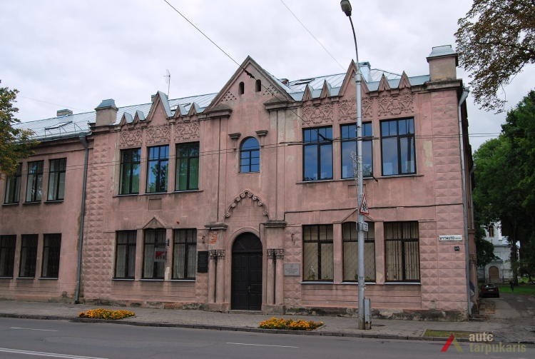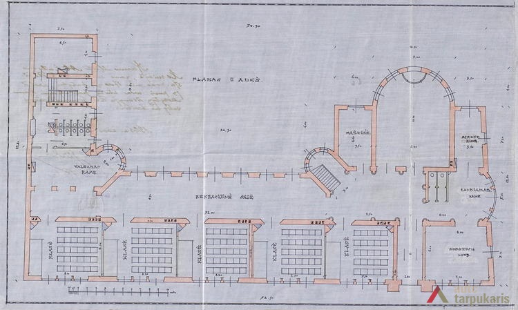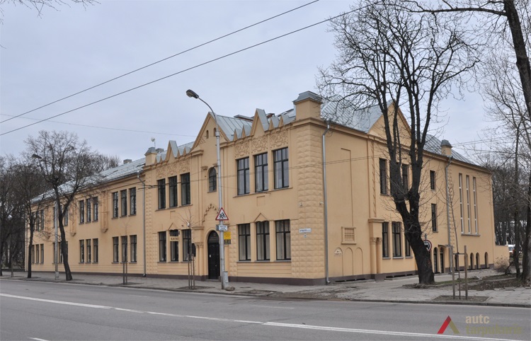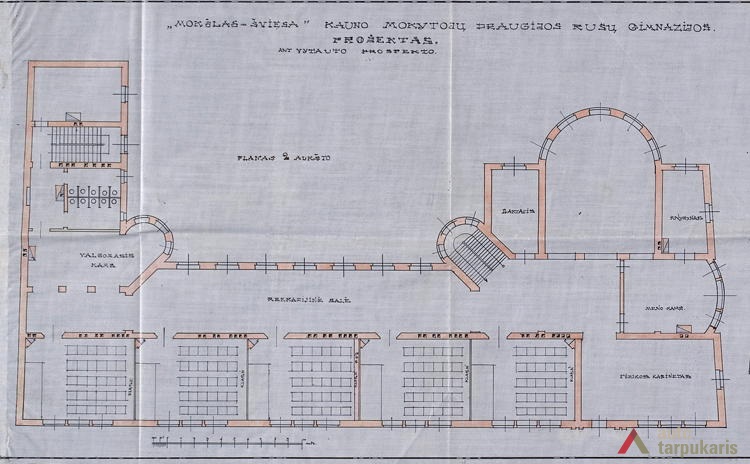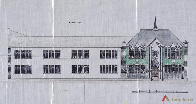 Kaunas Mokslas Ir Šviesa teacher society’s gymnasium building was one of the most magnificent educational objects in Kaunas during the first decade of the independence. “The attempt was to give it a romantic tone. The southern face of the building is accentuated by Neo-Russian style decor (faceted rustication, reliefs), cilindrical-shaped avant-corps on the back end are topped by embattled parapets picked up from Russian defensive architecture.” Although the building gives away a historical look, the functional layout of the school draws our attention to unusually wide corridors on both floors, referred to as the “recreational hall”. Hence, although the layout can hardly be called rational, it allowed having bright and open spaces which at that time was perceived as a clear sign of modernity.