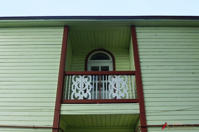 The two-storey log building is rectangular with a risalite on the eastern end and a basement underneath. The building has asymmetric composition common for resort villas. It stands out for its decorative turrets, and its ornaments on the main facade. The multi-pitched spar roof is adorned by two turrets with pinnacles. The roof is covered by tin sheets which was included in the original draft. The main entrance standing out for its representative architectural constructions – it has a spacious entryway with wooden pillars supporting the balcony on the second floor. The central balcony on the second floor recreates the trapezoidal entryway composition, while the balcony on the right of the main facade is roofed by wooden vaults. The balconies are decorated by open-carved geometrical ornaments.