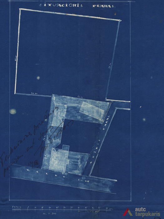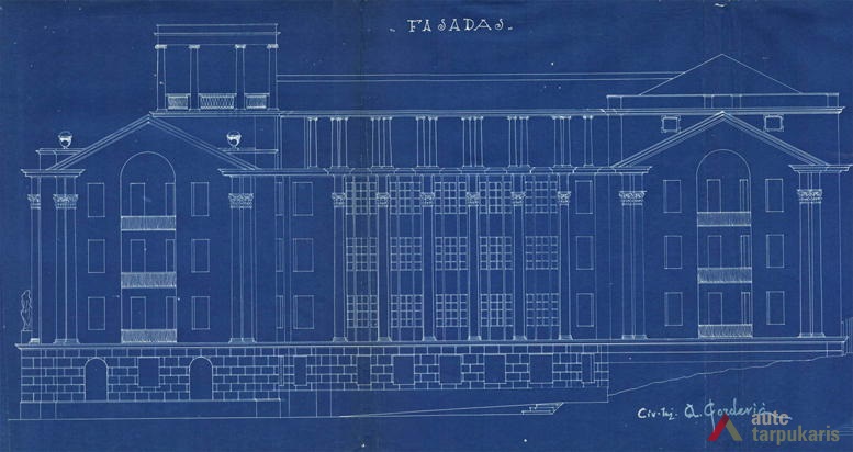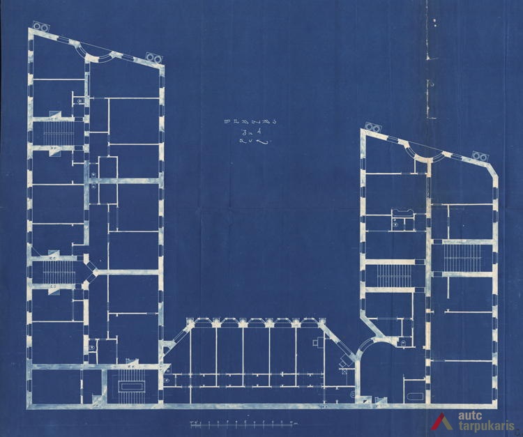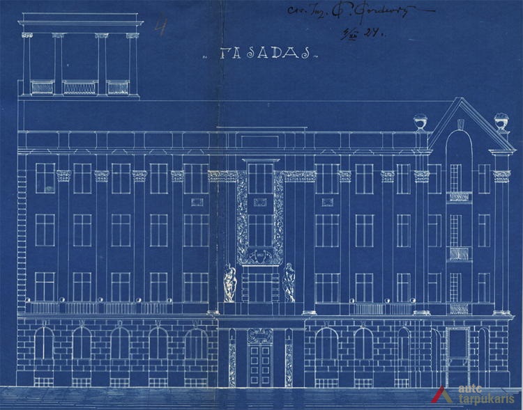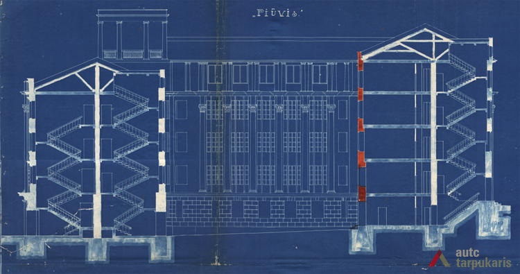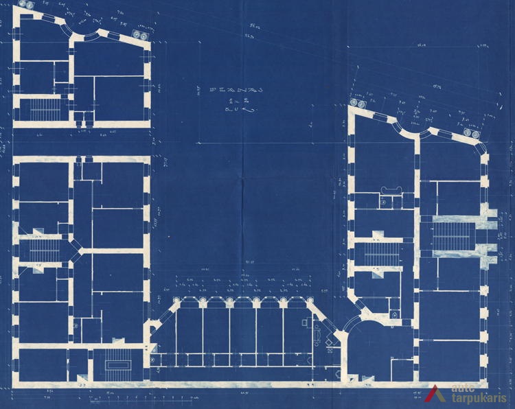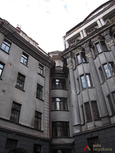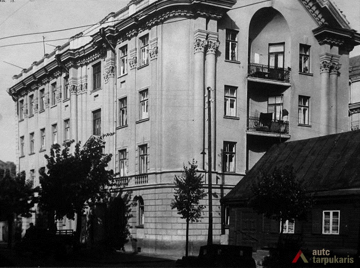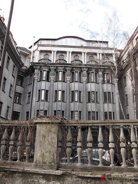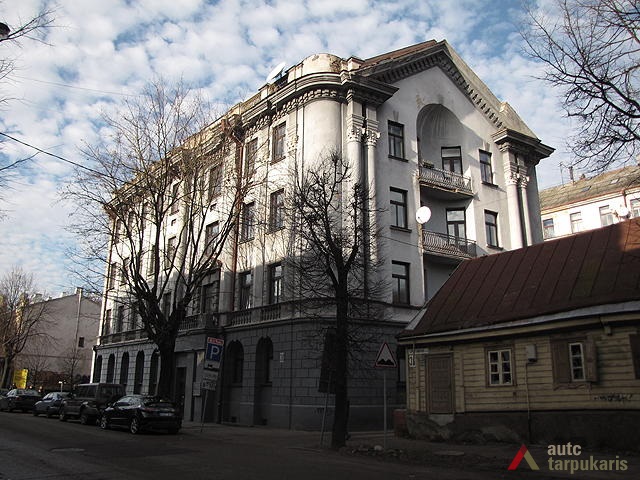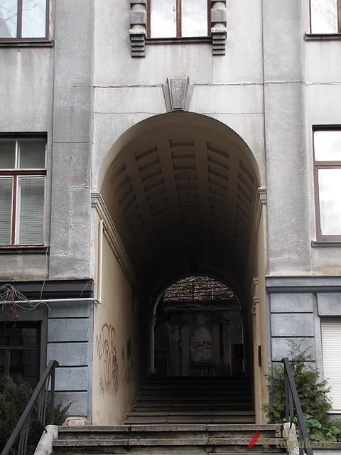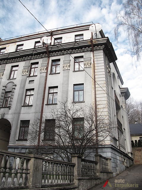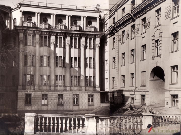 The residential house designed for the employees of the Bank of Lithuania was one of the largest and the most luxurious houses rented during the early interwar years. Besides apartments, it also had a hall and separate guest rooms. The building following the eclectic style of historicism was one of the first buildings to lay the foundation for the prestigious street of the interwar capital. The building erected in the not-so-populated area of the New Town had monumental architecture which resembled that seen in large cities. Luxury and disregard for the size surrounding structures can be evidenced not only by the representative facade facing V. Putvinskis Street, but also by the inner courtyard of the building. Very fancy facades are enhanced by a two-story high arched hallway which, unfortunately, leads straight to the slope.