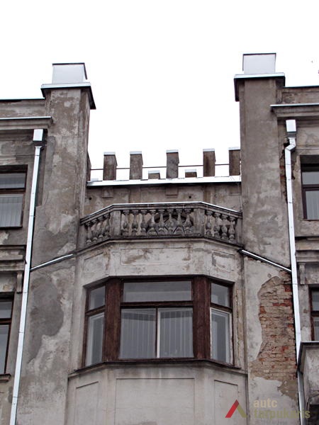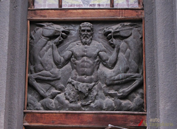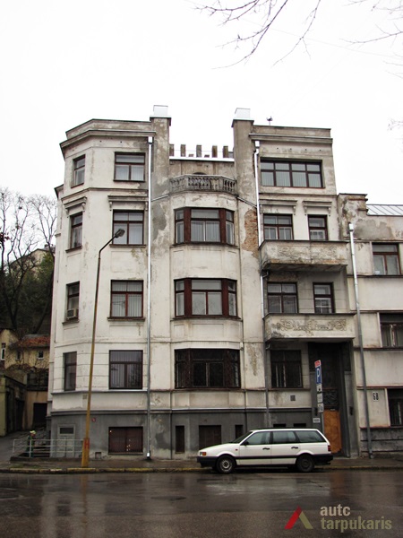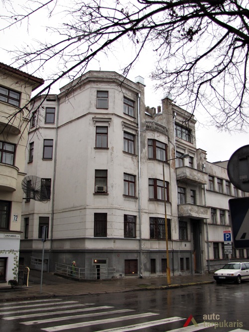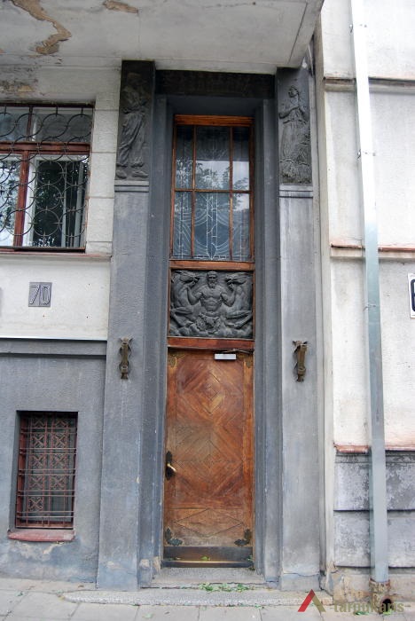 The house of the famous member of the public and the mayor of Kaunas city Antanas Gravrogkas was built in 1932. The building is one of the few residential objects designed by exceptional Lithuanian architect E. A. Frykas. The building perfectly demonstrates the harmonious play of modernist and historical trends characteristic of the architect. The facade of the four-story high building consists of four phases, the bottom three of which are brought out by fragmented protrusions ending with classical balcony enclosed by a balustrade. The balcony is connected by the higher sections of the facade on both sides. The left side of the facade by the entrance to the Western part of the site is rounded up, whereas the main entrance on the right hand side, although not highlighted, is decorated by bas-reliefs of agrarian and mythological elements (bronze bas-reliefs “Arklių Tramdytojas”, “Pjovėjas”, “Rinkėja” were designed by sculptor Juozas Zikaras in 1933). Flora motives seen on the second and third floor balconies can also be considered elements of folk art.