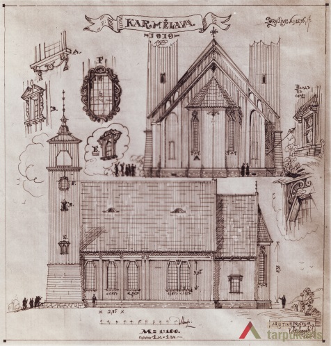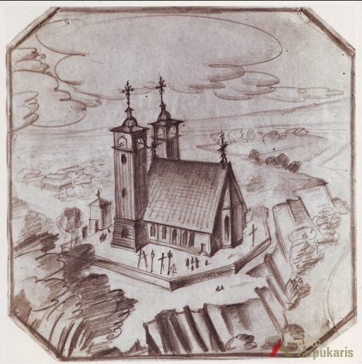 Church in Karmėlava. Photo by B. Buračas, 1937, publicated in „Miestai ir miesteliai Balio Buračo akimis“, Kaunas, 2007.