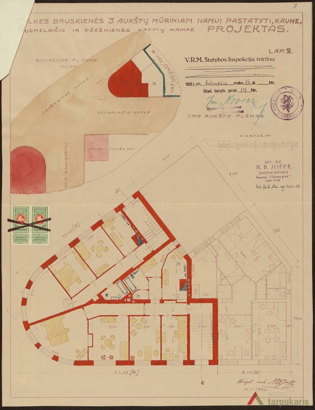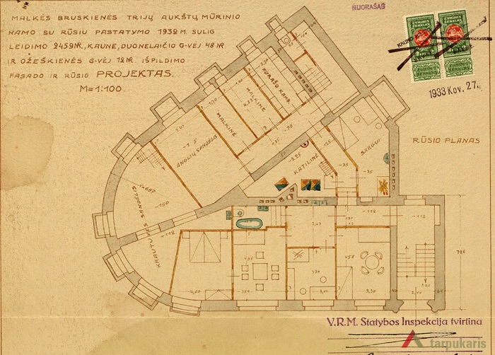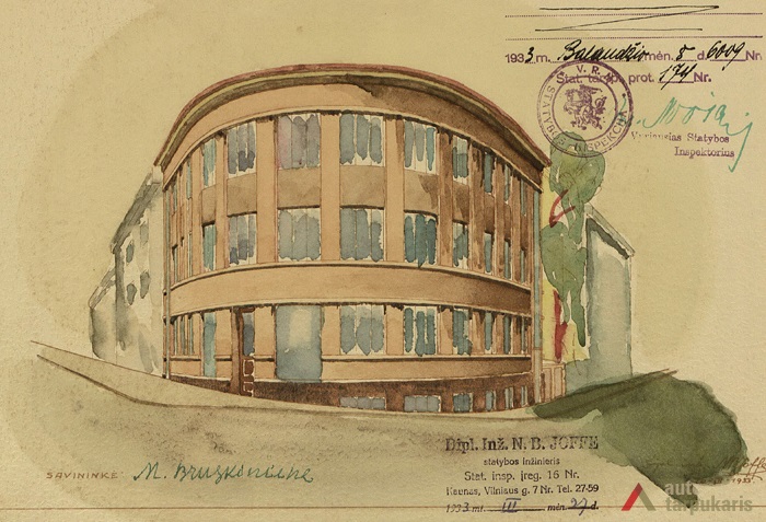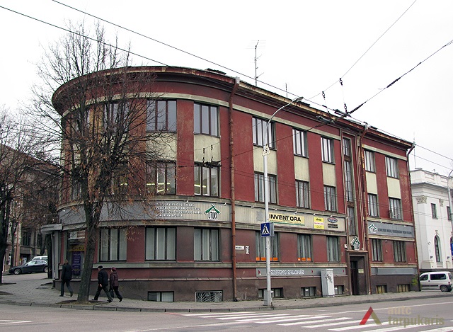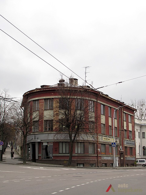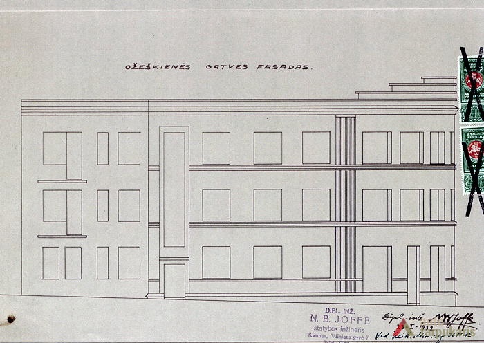 The building was designed by taking into account the uniqueness of local landscape and the shape of the property: the irregular V-shaped design was adjusted to a triangular plot, with the main, curved facade facing the intersection between E. Ožeškienė and K. Donelaitis Streets. The hollow shape of the building in a certain way matches the building of the Ministry of Justice on the other side of the street. It allowed to emphasise the significance of this intersection and to create a smooth highlight to end K. Donelaitis Street which was home to many state institutions during the interwar period. The facade of the house consists of two main phases: the first one includes the first floor which, as usual for buildings located in the city centre, was mostly occupied by public institutions, and the second phase included two residential floors. The slope on the Northern side was made up for by the mezzanine part of the building.
