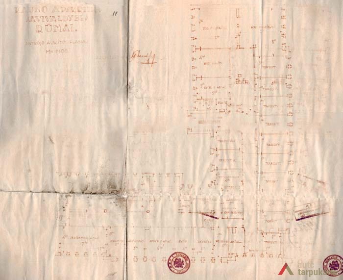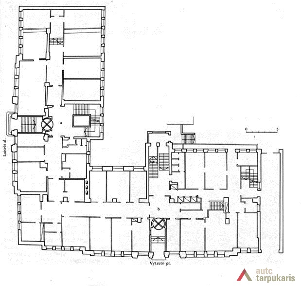 The structure of the building also manifested modernity and innovation (designers J. Šalkauskas and A. Rozenbliumas) - even though the building was built of bricks, "a supporting reinforced concrete framework was designed in the centre of the chief walls of two wings. Iron columns were built in important spots of the exterior walls". In fact, the use of the reinforced concrete structure considerably increased the price of the building, whereas the layout structure of the object was rather commonplace - rooms and other premises were arranged in line with the corridor system.