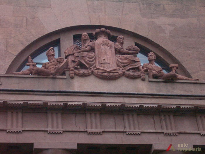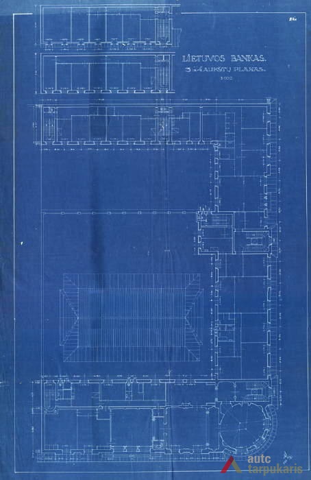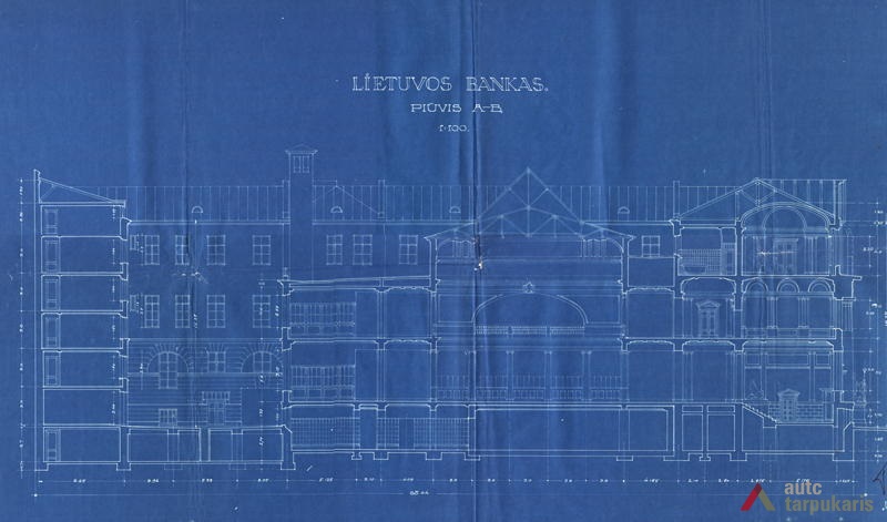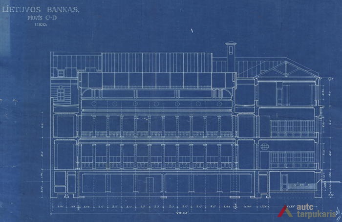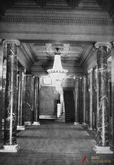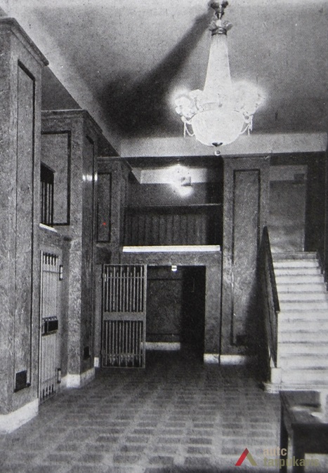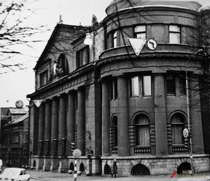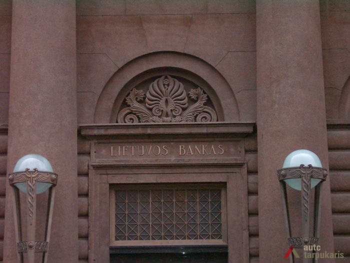 An international tender for bank office was announced in 1924. The first grant was awarded to an architect from Paris (name unknown), yet his design was very complex and expensive. Therefore, the design was delegated to the only Lithuanian professor of architecture at that time, the chairman of the jury M. Songaila. Technical maintenance of the construction was carried out by F. Vizbaras. The construction was completed in 1928. The corner section of the third floor facing Maironis Street included the apartment of Prime Minister A. Voldemaras with a library, an office room and official reception facilities; meanwhile, on the side facing K. Donelaitis Street — apartments of bank managers. The roof platform, enclosing the huge triangular-shaped skylight of the operation floor, had a “garden”. Down in the basement, under the operation floor there were vaults with special control hallways and security cameras (the security system was installed by an English firm). The palace had mechanical heating, moistening, and electric elevators. The courtyard side was designed for employee apartments, whereas the first floor had garages and the basement — utility facilities. Following WWII, the building hosted Kaunas Division of the State Bank. Now it has been returned to the Bank of Lithuania. Luxurious interiors of the bank used natural and artificial marble, granite, plastic and painted decor (artists P. Kalpokas, V. Didžiokas, O. Dubneckiene-Kalpokienė, J. Janulis), furniture of various styles, with the most valuable ones being luxurious lamps and chandeliers (art monuments of local significance). Geometric floor patterns of the lobby and the operation hall were laid out of greyish clay tiles, elsewhere the floors were out of parquet. The side staircase had a decorated stained glass (by artist S. Ušinskas) which did not survive. Lobby walls were finished by natural and artificial black, yellowish and brownish marble (artificial marble was produced by J. Dubovskis), black marble ionic columns separated grey staircase out of Swedish granite, ceiling caissons were decorated with rosettes (the same decor appeared in cloakroom ceiling).