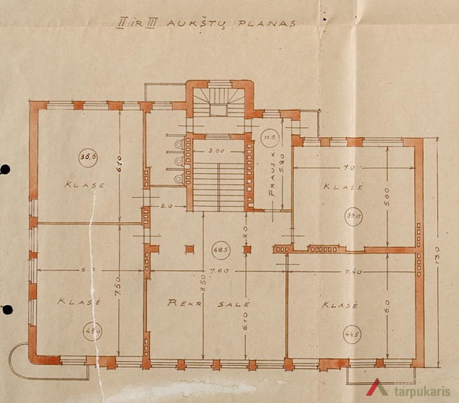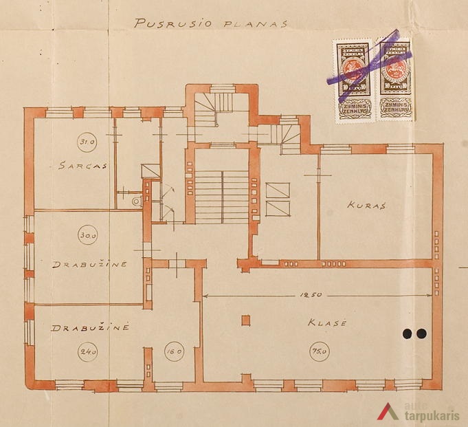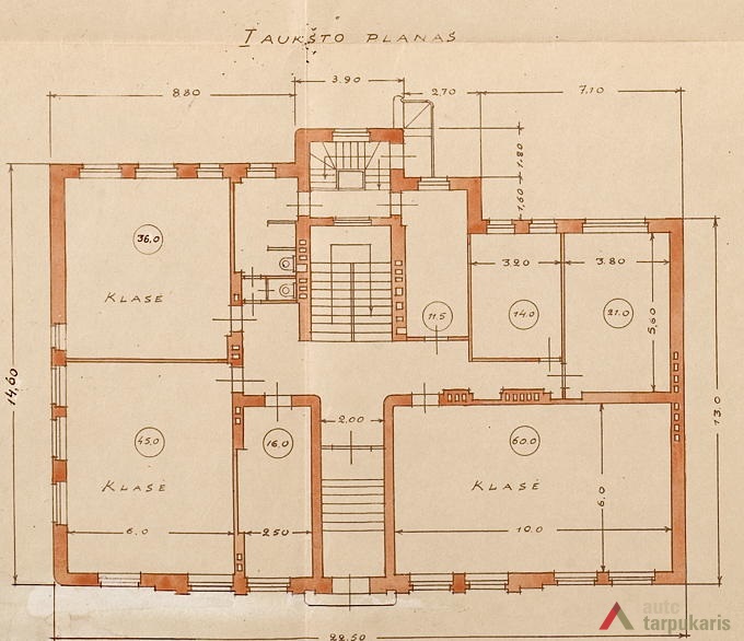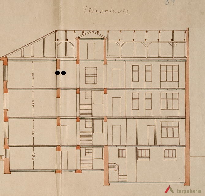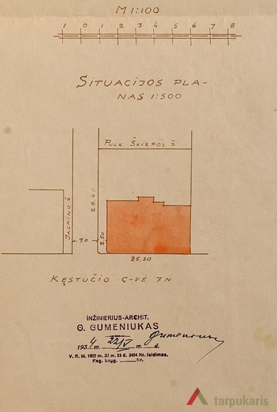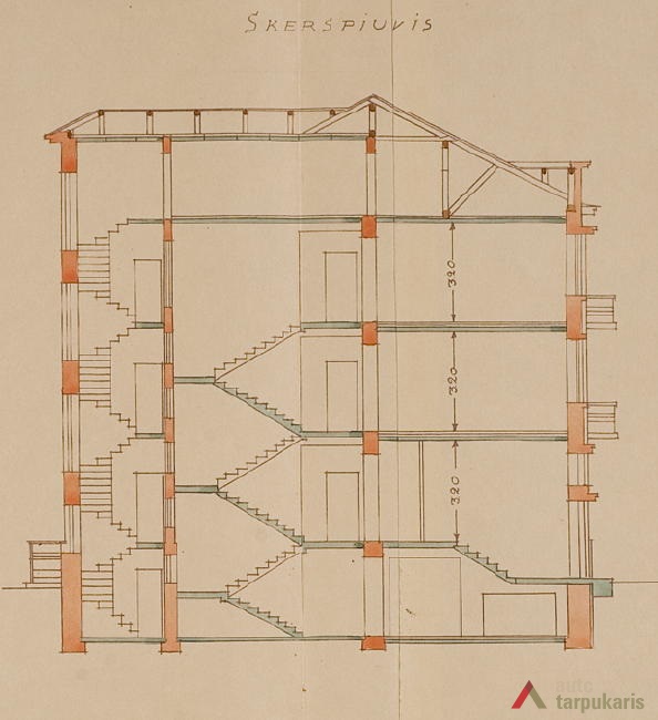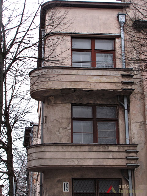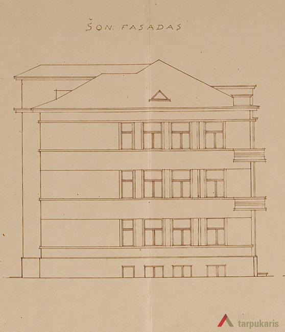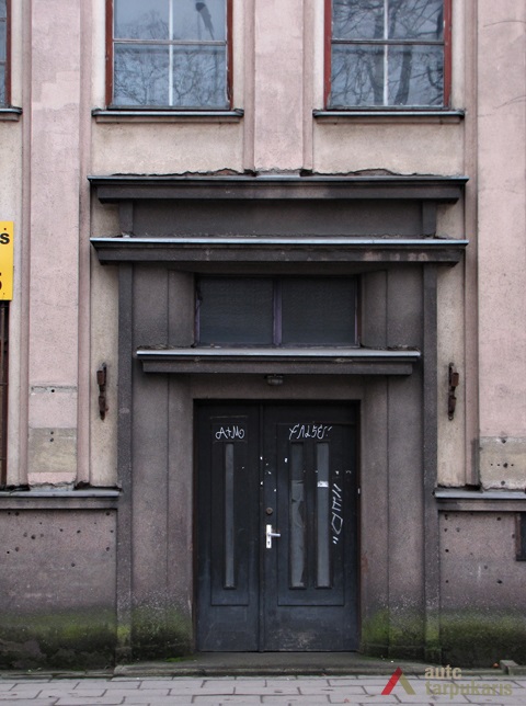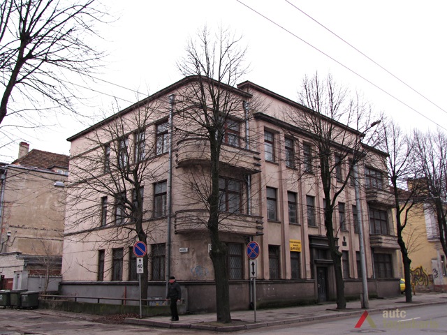 In the mid 1934 architect Grigorijus Gumeniukas submitted an application to the city’s construction department asking for permission to build himself a three-story residential house designed by himself. The building was erected with the aim of temporarily renting its premises to the city’s 3rd gymnasium, which is reflected in the draft of the building similar to that of schools for small classrooms cantered around the hallway. Although in the mid-thirties Lithuania was overwhelmed by the construction of new schools, an unusual decision to establish an educational institution in a private residence shows how serious was the lack of facilities in the growing temporary capital. The fact that the building did not match its temporary function can be evidenced by the fact that a fourth floor was later requested. The request was not granted “because the requested structure would be inconsistent with those of other houses on the opposite side of the street”. The building retained its function after the Soviet nationalisation – it was home to Kaunas 3rd secondary school.