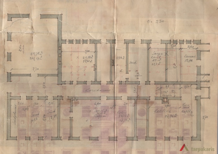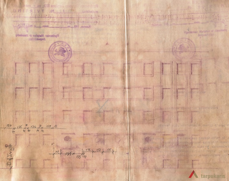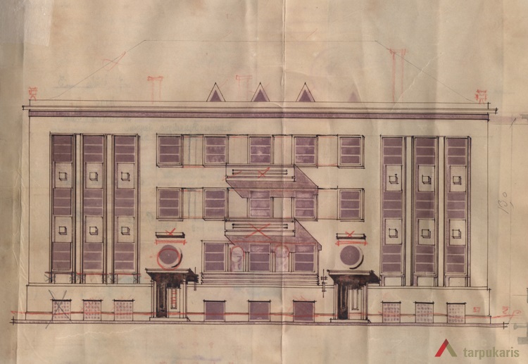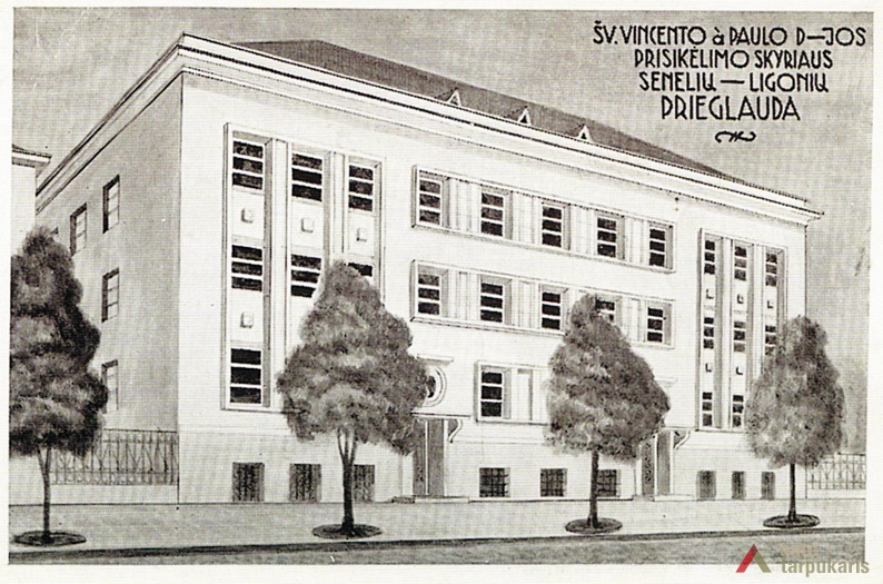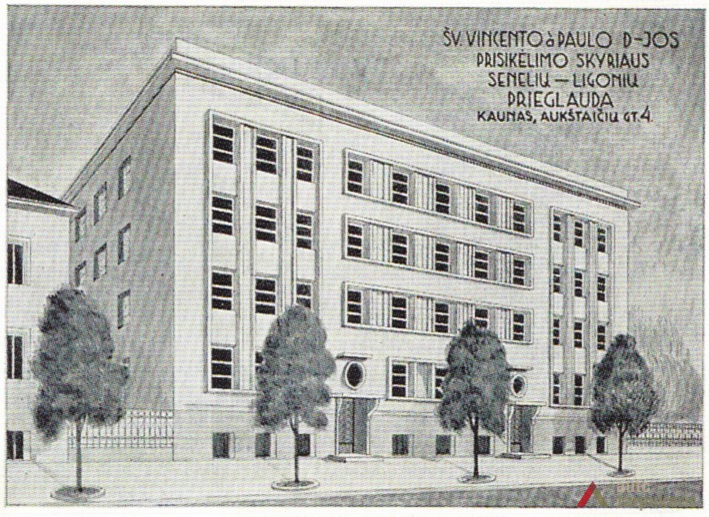 Charitable social work of St Vincent Paulietis’ fellowship was crowned by their biggest and most famous project - the Old People’s Home on Aukštaučių Street. After its opening in 1938, K. Reisonas’ design for the elderly care home set new standards for this type of institutions in the whole country. Initially Reisonas designed a symmetrical three floor building with a pitched roof. The original project, however, was altered during the process of the construction by adding one more floor, and by assembling a flat roof. The finished structure received much praise from the contemporary press. The occupants of the house enjoyed spacious corridors, south-facing balconies, sitting rooms, and bathroom facilities on each floor. The flat roof was converted into a spacious and green roof terrace. The newly built institution was also fully supplied with radio equipment and speakers for quick and efficient communication. After the occupation of Lithuania by Nazi Germany in 1941, the exceptionally progressive elderly home were transformed into a Tuberculosis hospital.