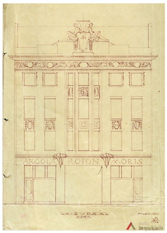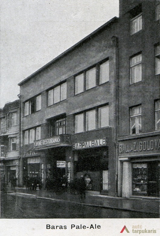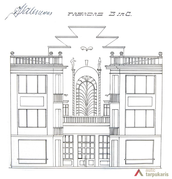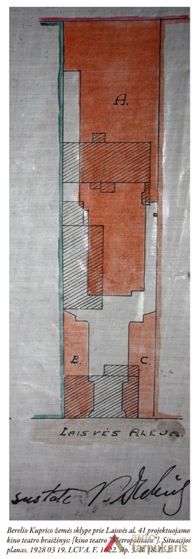 Laisves alley was the main concentration center for movie theatres, where “Metropolitain” was also located. The request to build a movie theatre in private property was delivered by Borisas Kupricas in 1927. The building was designed far in the plot, dragged away from the Laisves alley, and two separate main buildings were planned next to the street. However in 1929, a modern architecture building was built instead of them with a drive-in left in the middle. The house hosted a number of shops, other service providers with modern, city’s spirit revealing names: “Fru-Fru”, “Fortuna Film”, “ideal”, “Pale-Ale”. The last one was a bar-restaurant and occupied the biggest space of the building.