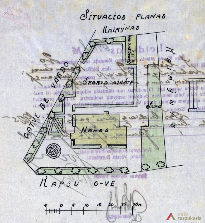 Didelio tūrio mediniame statinyje pagrindinį puošybos elementą sudarančios kelios lentelių apkalimo ir išpjaustymo variacijos atspindi vis dar gajas carinio laikotarpio statybos tradicijas. Kauno mieste unikalų prieglaudos dvipakopio stogo pasirinkimą, atsižvelgdami į aplinką, galime laikyti racionaliu – tarp netoliese esančių vien tik gerokai mažesnių gyvenamųjų statinių toks stogas savotiškai sušvelnina gan didelį pastato tūrį. Įdomu ir tai, kad pastato projekte taip pat numatyta, kaip turėtų būti sutvarkyta aplinka, sklypo teritorijoje įrengta sporto aikštė.