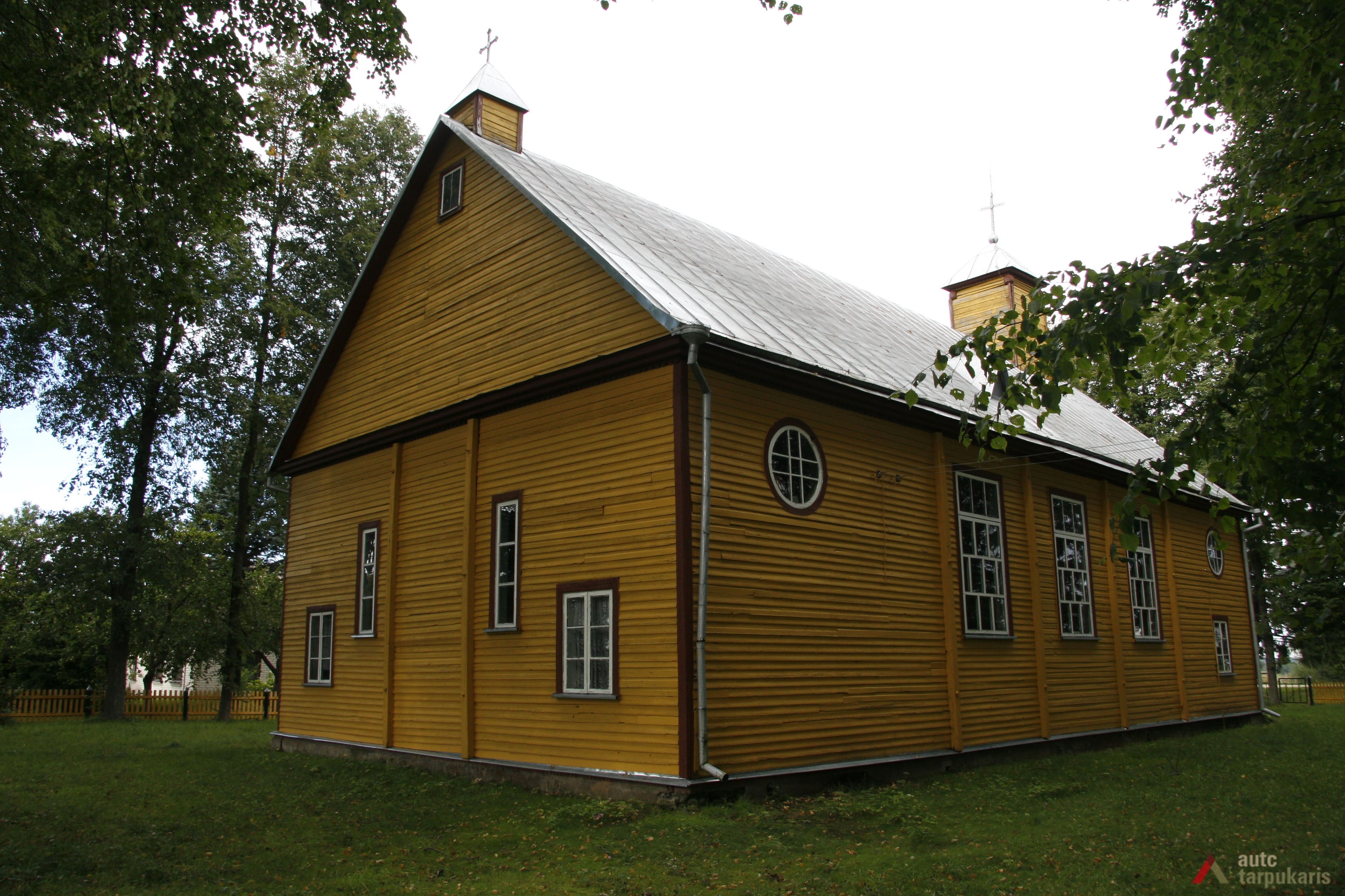 Šoninius fasadus skaido trys stačiakampiai langai; iš galų viršuje yra po apskritą langelį. Galiniame fasade langų kompozicijoje išsiskiria siauri ilgi stačiakampiai langai, esantys presbiterijos dalyje abipus didžiojo altoriaus. Fasadų apdailos tipas – horizontalus apkalimas lentomis.