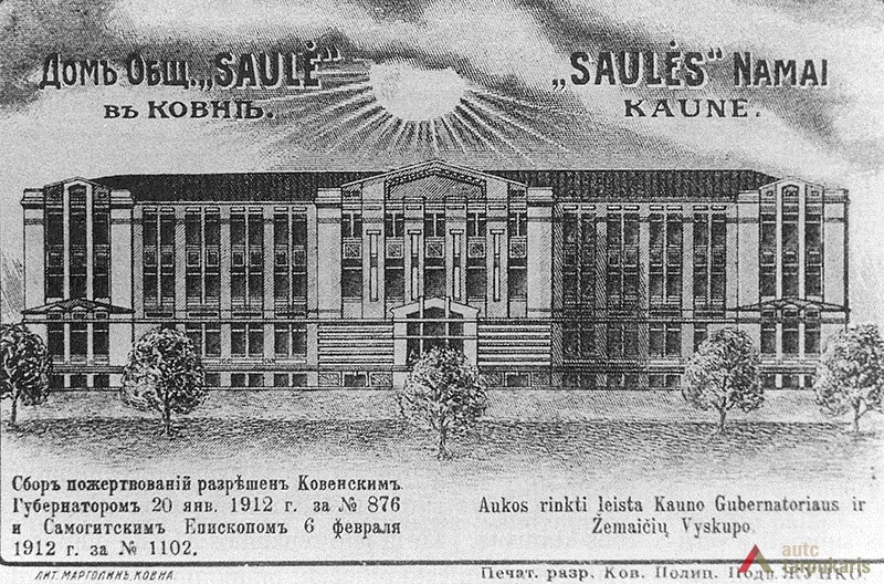 1912 m. pavasarį pradėti mūryti „Saulės“ namų pamatai, pašventintas kertinis akmuo[6]. Pagal išankstinę sąmatą pastatas turėjo kainuoti 120000 rublių[7]. Sunkumų iškilo derinant projektą. Tvirtovės komendantas iš pradžių neleido statyti ant kalno trijų aukštų pastato, tačiau per Kauno gubernatorių Piotrą Veriovkiną, kuris buvo palankus lietuvių tautiniam judėjimui, buvo gautas leidimas tiesiogiai iš Peterburgo[8]. Rūmus projektavo tuometis gubernijos architektas Fiodoras Malinovskis, statybų darbų priežiūros inžinieriumi paskirtas Konstantinas Šakenis. Darbai ėjo sparčiai, nors ir buvo atliekami rankiniu būdu, be jokių mechanizmų. Statybose nuolat dirbo penkiasdešimt mūrininkų, atvykusių iš Vitebsko gubernijos, jiems talkino ir pagalbiniai darbininkai iš Kauno. Rūmai pastatyti stebėtinai greitai – per pusantrų metų[9].