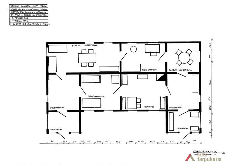 Suvalkietiškos stubos – gyvenamojo namo – planavimas kiek skiriasi nuo tradicinio, nes viename namo gale įrengta pradžios mokyklos klasė. Namas statytas 1919–1920 m., po Pirmojo pasaulinio karo, kai kūrėsi valstybė ir trūko patalpų mokykloms. Dažna kaimo ar miestelio mokykla būdavo įrengiama gyvenamajame name, kurio savininkas sutikdavo išnuomoti patalpas savivaldybei, atsakingai už mokyklų steigimą. Kartais name gyvendavo ir mokytojas su šeima. Šio namo pagrindiniame fasade netradiciškai simetriškai namo ašiai yra du įėjimai, pastatytos dvi verandos, dvi priemenės. Atskiras įėjimas buvo reikalingas mokiniams, pastarieji juo patekdavo į klasę. Namas su Suvalkijai būdingu ertikiu. Tai pat šiam regionui buvo būdingi čerpėmis dengti stogai. Namo langai dideli, šešių dalių, plačiais apvadais, su trikampio frontonėlio formos viršulangiais. Namas iki langų vertikaliai apkaltas lentelėmis. Iki stogo namą puošia vertikaliai sukaltų drožinėtų lentelių linija, kuri sudaro ornamentą ir suteikia namui puošnumo. Tai bežemio staliaus Pauliukevičiaus (g. 1900 m.) darbas. Namą statė meistras Radzevičius.