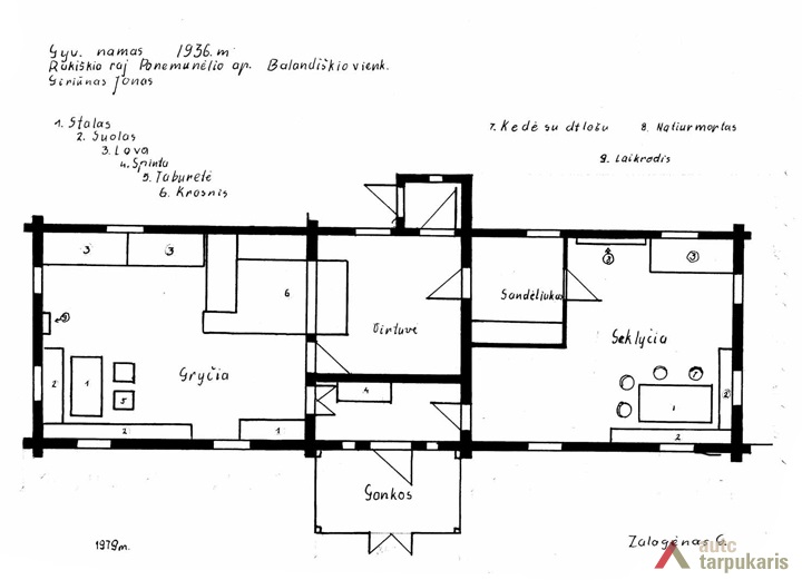 Tradicinis aukštaitiškas gyvenamasis namas (gryčia), statytas 1936 m. Planas būdingas dvigaliam aukštaitiškam namui: pastato centre – priemenė, viename gale seklyčia, kitame – gryčia. Yra keli tradicinio planavimo pakitimai: atsiradusi virtuvė vietoje kamaros (atitverta nuo priemenės) bei nuo seklyčios atitvertas sandėliukas. Be to, pristatytas ūkinis įėjimas (priestatėlis). „Paradinis“ įėjimas įrengtas su „gonkomis“ (prieangiu). Svarbiausia gyvenamojo namo patalpa laikoma gryčia su didele duonkepe krosnimi. Duonkepė krosnis daugiafunkcinė – joje virė valgį, kepė duoną, ja apšildė patalpą, ant jos miegodavo. Gyčioje vykdavo šeimos gyvenimas. Kitame gale – seklyčia. Šiame name seklyčia nešildoma, joje nėra krosnies. Dažniausiai ši patalpa naudota svečiams priimti, joje stovėjo geresni baldai. 1979 m. name dar buvo išlikęs tradicinis baldų sustatymas, interjeras, tikėtina, mažai pakitęs (tuo metu namas priklausė Jonui Giriūnui). Tiek gryčioje, tiek seklyčioje ties langais stovėjo stalai, o pasieniais – suolai. Lovos statytos palei kitą sieną, toliau nuo durų.