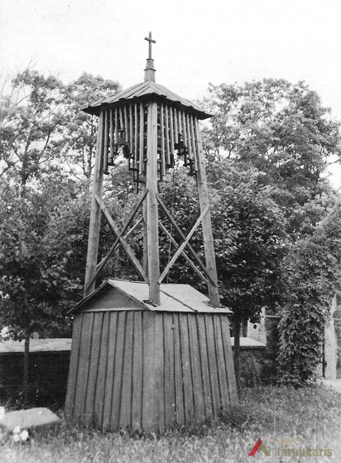 Bažnyčios šventoriaus dešinėje pusėje stovi medinė varpinė su keturiomis angomis viršutinėje dalyje. Varpinės sienos viršuje truputį siauresnės[4]. Nors šiandien varpinė yra vientiso tūrio, tačiau iš ankstyvojo sovietmečio fotografijų matome, kad anksčiau viršutinė statinio dalis lentelėmis nebuvo apkalta. Tai objektui suteikė kur kas elegantiškesnį, ažūrišką pavidalą.