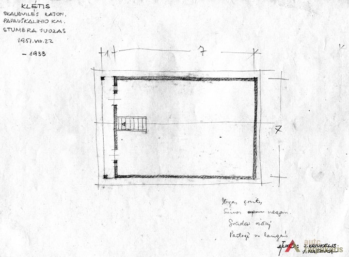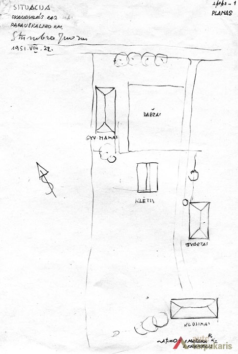 Šią žemaitišką sodybą sudaro gyvenamasis namas, svirnas, tvartas ir klojimas. Kiekvienas pastatas tradiciškai turėjo savąją vietą. Priešais gyvenamąjį namą plytėjo nedidelis daržas. Gyvenamasis namas galu orientuotas į kaimo gatvę. Netoli namo stovi svirnas (šiame krašte vadintas klėtimi). Svirnas statytas 1933 m. Jis nedidelio tūrio, vienos patalpos (7x7 m), su galiniu įėjimu ir gana plačiu priesvirniu (1 m). Svirnams būdingi priesvirniai saugojo duris nuo kritulių, čia buvo sandėliuojami rakandai. Pastarojo svirno pastogėje laikyti grūdai. Pastatas dengtas gontais. Tradicinėje sodyboje tvartai statyti atokiau nuo gyvenamojo namo. Šioje sodyboje tvartas suręstas pakankamai toli nuo namo ir svirno, sklypo krašte, prie kiemo keliuko. Kitas svarbus sodybos pastatas – kluonas (klojimas) – skirtas javams laikyti, džiovinti ir kulti, taip pat kluonuose buvo laikomas šienas. Čia kluonas stovi atokiausiame sodybos sklypo pakraštyje. 1951 m. sodyba priklausė Juozui Strumbrai.