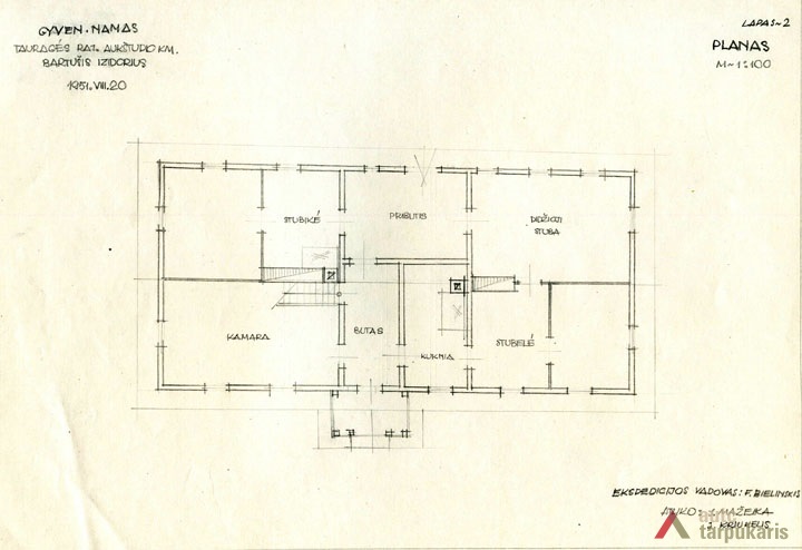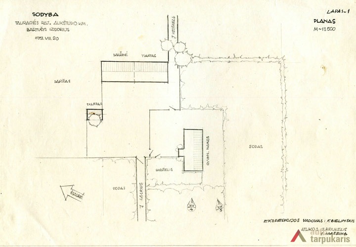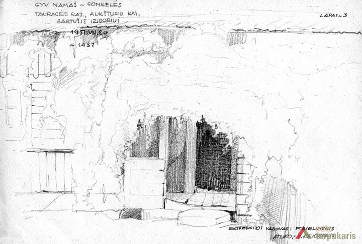 Sodyba nedidelė, priklausė neturtingam ūkininkui. Ją sudaro tik gyvenamasis namas (troba), tvartas su daržine, kurie telpa po vienu stogu, ir rūsio pastatėlis. Trūksta tokių tradicinių pastatų kaip svirnas, klojimas, daržinė. Erdvė tarp ūkinių pastatų formuoja „blogąjį“ (ūkinį) kiemą. Arčiausiai gyvenamojo namo įrengtas rūsys, kuriame laikyti šakniavaisiai, podėliui. Paprastai žemaitiškuose rūsiuose būdavo kelios patalpos (patalpa su akmenimis grįstomis duobėmis, skirta daržovėms, kamaraitė – namų apyvokos daiktams laikyti). Ties įėjimu būdavo pastogė (lėpis). Sodybos gyvenamasis namas nuo ūkinio kiemo aptvertas tvora, šalia namo tradiciškai užsodintas gėlių darželis, kuris irgi atitvertas tvorele. Gyvenamąjį namą supa didelis sodas. Į namą patenkama per prieangį, apsodintą vynuogėmis, kas gan reta Žemaitijos sodybų apželdinime. Namas statytas apie 1937 m. Tai dviejų galų žemaitiška troba su gan išplėtotu planu: name yra devynios patalpos. Kai kurios iš jų vadintos „stuba“ ar „stubike“ – Suvalkijos gyvenamųjų namų įtaka. 1951 m. sodyba priklausė Izidoriui Bartušiui.
