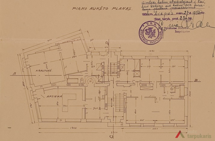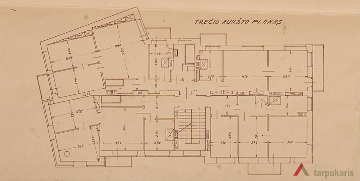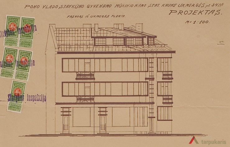 Namas priklausė Vladui Stankūnui. Savanorių pr. ir Vaistinės skersgatvio kertėje iškilęs pastatas netradicinio, asimetriško plano. Rūsyje buvo sandėlys, anglinė, atskirų butų sandėliukai, skalbykla ir sargo butas[1]. Pirmame aukšte veikė parduotuvė ir vaistinė (vaistine čia veikia ir dabar). Beje, iš pastarosios į antrąjį aukštą vedė sraigtiniai laiptai. Antrame ir trečiame aukšte buvo dideli butai. Nedideliame sklype šalia namo – kartu projektuotas ir netaisyklingo plano garažas su sandėliu, tualetu bei pamazgų duobe.