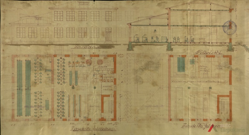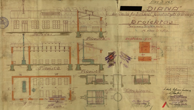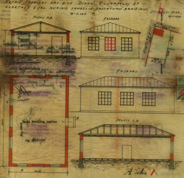 1932 metais naujame sklype pastatytas 135 kv. m dydžio vieno aukšto mūrinis sandėlis (inž. B. Klingas), atitrauktas nuo statybos linijos (Vilkijos gatvės) per 5 metrus. Po metų (1933-siais) patvirtintas dviejų aukštų mūrinio fabriko statybos projektas (techn. J. Martynaitis) su sąlyga, jog bus vedama technikinė priežiūra, pertvara tarp tualeto ir valgyklos storesnė nei 0,5 plytos, įrengta ventiliacija fabrike ir tualetuose, pasirūpinta pakankamu gesintuvų skaičiumi[2].