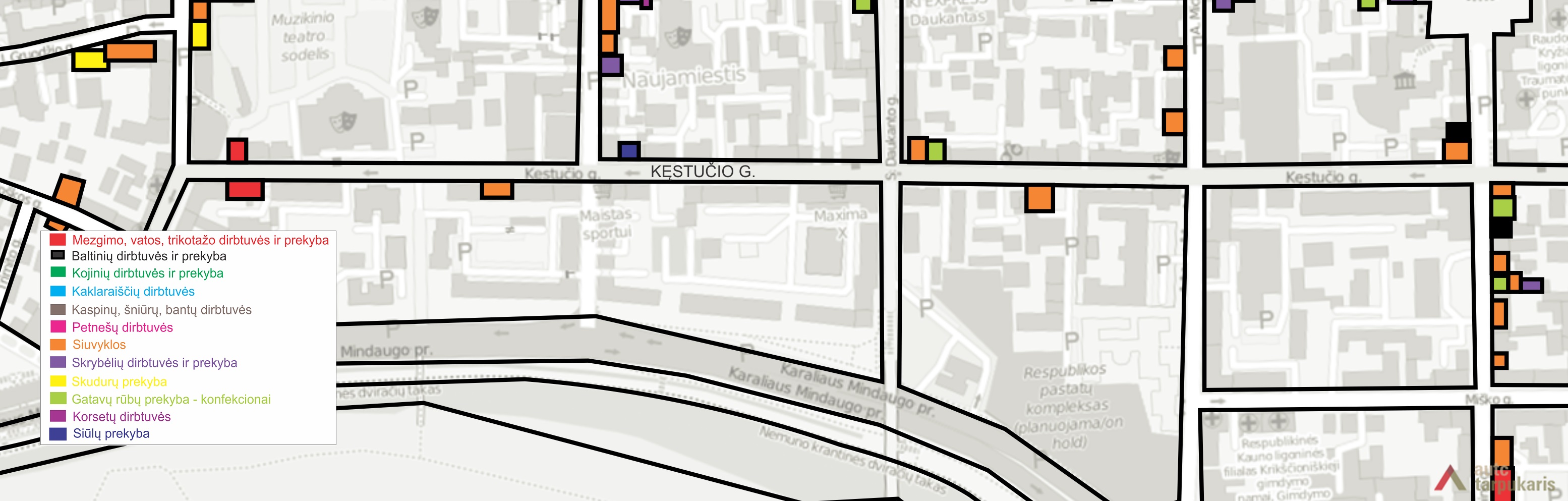 Ketvirtajame dešimtmetyje Kęstučio gatvėje buvo įsikūrusi Gertrūdos Dulmanienės moteriškų skrybėlių krautuvė, trikotažo dirbtuvė „Glalev“ ir trys moteriškų rūbų siūvyklos: tuometiniame 12-ajame name buvo Elenos Valterienės siūvykla, 16-ajame – Elenos Ruseckaitės, o 25-uoju numeriu pažymėtame name –Roche Reicha[1].