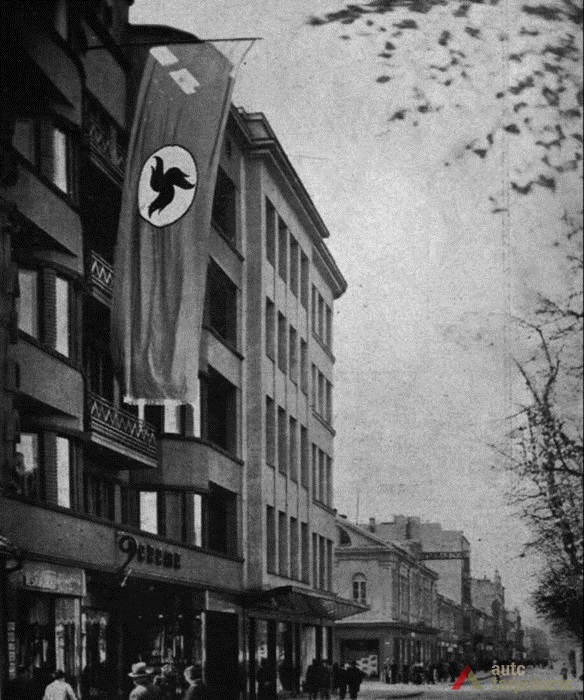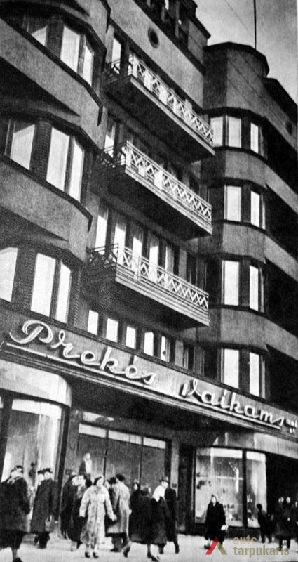Architekto F. Vizbaro suprojektuoti bei rangovų D. ir G. Ilgovskių pastatyti „Pažangos“ bendrovės rūmai – vienas iš reprezentatyviausių tarpukario laikotarpio objektų, skirtų biurams. 1934 m. balandžio 14 d. Kauno miesto savivaldybės Statybos skyrius gavo AB „Pažanga“ pranešimą: „Naujai pastatytų rūmų kiemo flygelio I a. įsikūrusi L. T. S. [Lietuvos tautininkų sąjungos] Centro valdybos būstinė; II aukštą užėmė „Pažangos“ bendrovė; [III a. ?] „Lietuvos Aido“ administracija; Laisvės alėjos flygely „Lietuvos Aido" vyr. redaktoriaus ir jo sekretoriaus kabinetai; IV a. L. T. S. klubo patalpos; rūmų ūkio vedėjo butas ir „Jaunoji Lietuva“ Centro valdybos būstinė; V aukšte „Lietuvos Aido“ redakcijos narių ir „Jaunosios kartos“ redakcijos ir administracijos patalpos“[1]. Vėliau penktame aukšte įsikūrė restoranas, o pirmame – parduotuvė. Ant stogo įrengta terasa. Rūsyje po kiemu buvo įrengta posėdžių salė, apšviečiama per viršutinius blausaus stiklo švieslangius[2].
