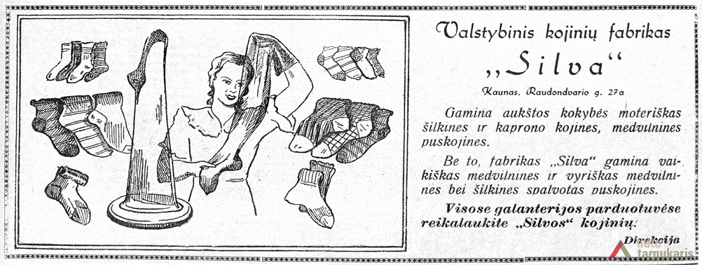 Bendrovės įstatuose nurodyta, kad jos „tikslas yra ir įvairių trikotažo prekių išdirbimas bei prekyba visokiomis kitomis tos pat rūšies prekėmis“[4], nors produkcijos pagrindą sudarė moteriškos kojinės. Čia dirbo apie 50 darbininkų. Bendrovė visą laiką veikė pelningai. 1939 m. sausio 1 d. jos akcinis kapitalas siekė 1 250 000 litų, o atsarginis kapitalas – 71 500 litų[5]. Bendrovė „1940 m. liepos mėnesį buvo nacionalizuota ir tapo Valstybiniu kojiniu fabriku „Silva“[6]. Karo metais fabrikas tęsė savo veiklą ir buvo pervadintas į „Strumf und Wirkwaren fabrik „Silva“.“[7]