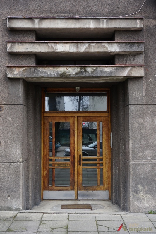 Įgilintas, laiptuotas portalas priderintas prie modernios fasado išraiškos. Plačios, dvivėrės durys su siauru viršulangiu ir didžiąją dalį sąvarų užimančiais įstiklinimais. Įstiklinimus ties centru skaido po tris medžio juosteles. Kairėje pusėje, tarp jų subtiliai įkomponuota korespondencijos anga. Plačius įstiklinimus vizualiai susiaurina vertikalĮgilintas, laiptuotas portalas priderintas prie modernios fasado išraiškos. Plačios, dvivėrės durys su siauru viršulangiu ir didžiąją dalį sąvarų užimančiais įstiklinimais. Įstiklinimus ties centru skaido po tris medžio juosteles. Kairėje pusėje, tarp jų subtiliai įkomponuota korespondencijos anga. Plačius įstiklinimus vizualiai susiaurina vertikalios medžio juostelės sąvarų kraštuose. ios medžio juostelės sąvarų kraštuose.