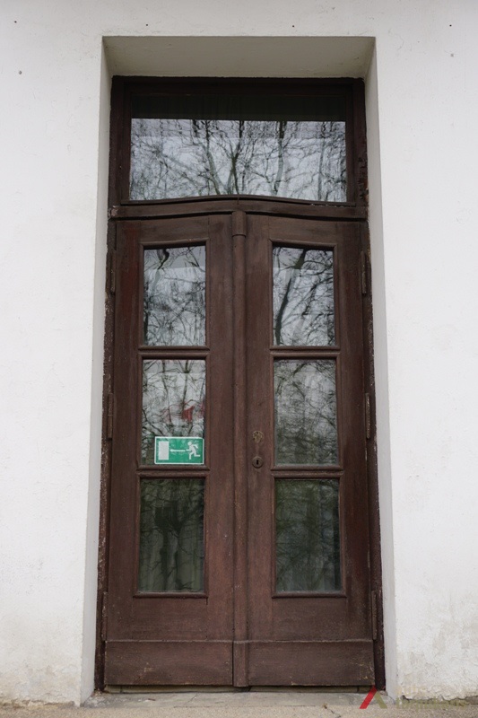 Iš išlikusio projekto matyti, kad architektas V. Landsbergis-Žemkalnis pasirinko pagrindinio įėjimo neakcentuoti, jis įrengtas šiek tiek atitrauktoje pagrindinio fasado dalyje. Tad ir durims pritaikytas nuosaikus dizainas. Durys vienvėrės su viršulangiu (šiuo metu menininkų iškaba), įsprūdinės konstrukcijos be dekoro. Išlikusi spalvoto metalo durų furnitūra. Išraiškingesnės įstiklintos terasos durys. Dvivėrių durų išlenktas viršus atsikartoja languose, kaip ir Žmuidzinavičiaus name. Pastato viduje taip pat yra išlikusių lenktų durų.