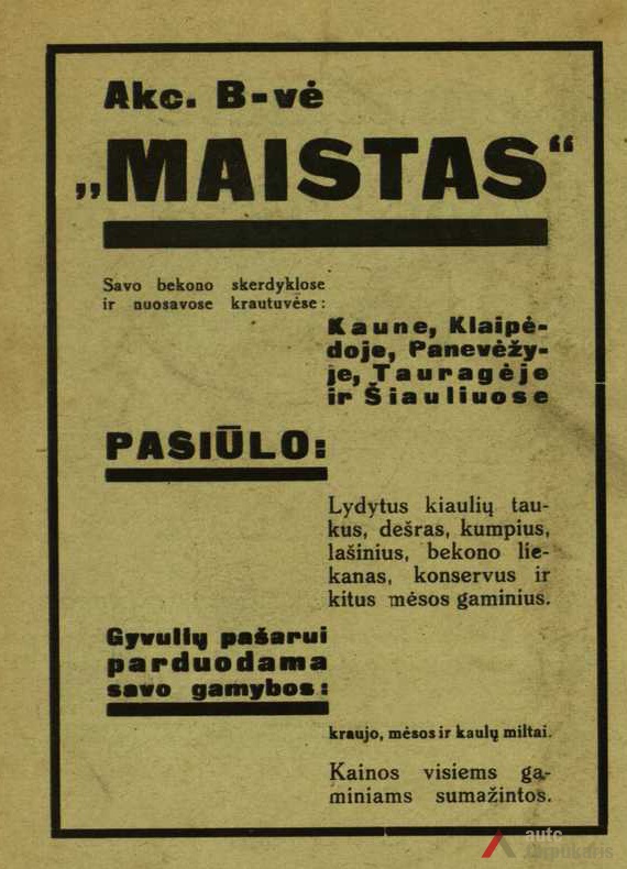 [11] „Maisto“ bekonų fabrikas Tauragėje. Lietuvos žinios, 1932 m. kovo 29 d., p. 4.