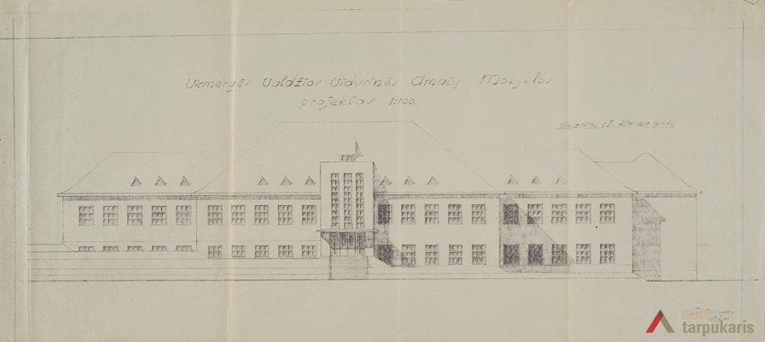 Lietuvos centriniame valstybės archyve saugomi įdomūs statybos inžinieriaus Juozo Vadopalo parengti projektiniai mokyklos eskizai. Tenka pastebėti, kad keleto gana skirtingų eskizinių projektų parengimas mokymo įstaigos pastatui – gana retas reiškinys tarpukario kontekste. Sunku pasakyti kokios aplinkybės paskatino šių projektų atsiradimą, tačiau akivaizdu, kad eskizai savo charakteriu kur kas individualesni, savitesni, nei iškilęs pastatas. Inžinierius tuo metu dirbo Susisiekimo ministerijos Radviliškio kelio ir statybos ruože[7].