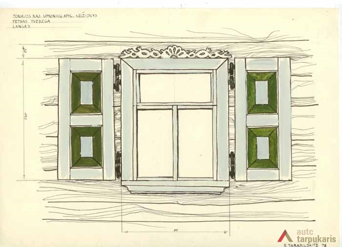 Gyvenamojo namo langas. Jo dydis 110x95 cm, langinių – 110x47 cm. Langinės įsprūdinės. Antlangis papuoštas kiaurapjūviu augalinio motyvo ornamentu. Palangė padabinta profiliuota atbraila. Langas trirūtis. Viršuje gulsčiai orientuota rūtis, apačioje – dvi statmenos.