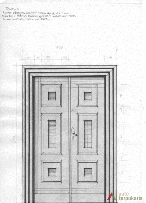 Gyvenamojo namo durys, pagamintos apie 1923 m., kai statytas namas. Dvivėrės, įsprūdinės, dekoruotos kvadratais ir stačiakampiais. Apvadai papuošti išdrožomis. Durų matmenys 203x141 cm.