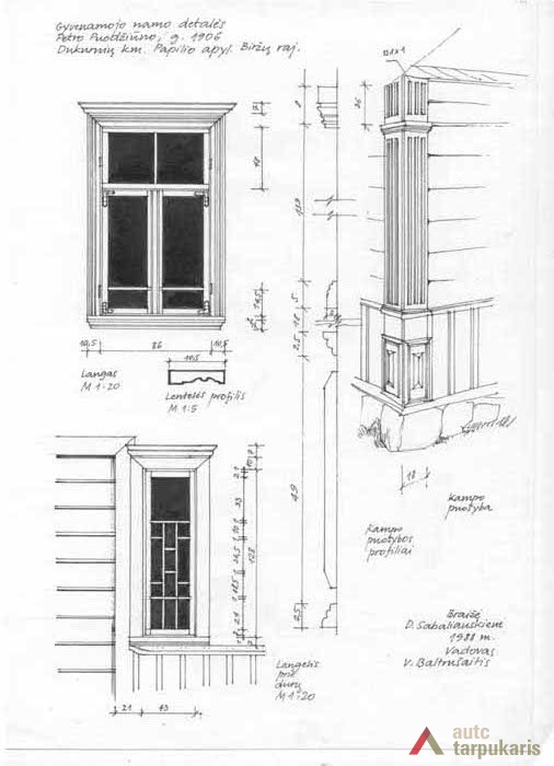 Brėžinyje pavaizduoti gyvenamojo namo langas, langelis prie durų ir namo kertė. Langas sudalytas į tris dalis (dvi varstomos, viršutinė nevarstoma), tokie langai plito XX a. pr. Lango apkalos profiliuotos. Langelis prie durų suskaidytas į kelias smulkesnes simetriškas dalis – rūčius. Namo kertės apkalos profiliuotos, sudarytos iš trijų dalių. Apatinės dalies aukštis sutampa su namo apkalos vertikaliomis juostelėmis aukščiu. Šioje dalyje matome puošybos elementą – iškilų stačiakampį.