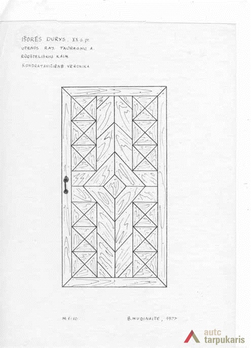 XX a. pr. vidinės ir išorinės, skirtingų patalpų gyvenamojo namo durys. Išorinės durys vienvėrės, dvisluoksnės konstrukcijos, sukaltos lentelės sudaro ornamentą.