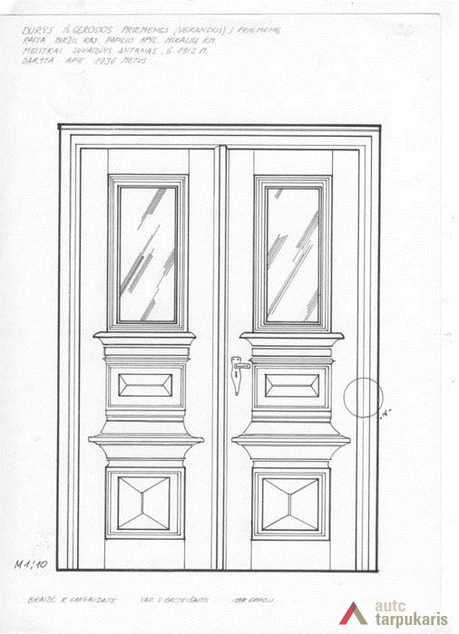 Gyvenamojo namo durys. Iš gerosios priemenės (verandos) į priemenę. Dvivėrės. Įsprūdinės konstrukcijos: lentelės įstatytos į rėmus, kurie dalija duris į stačiakampius laukus, juose – puošnūs profiliuoti elementai. Viršutiniuose stačiakampiuose laukuose įstiklinti langai. Įsprūdinės durys ypač paplito XX a. Pastarąsias gamino meistras Antanas Suveizdys (g. 1912 m) apie 1936 m.