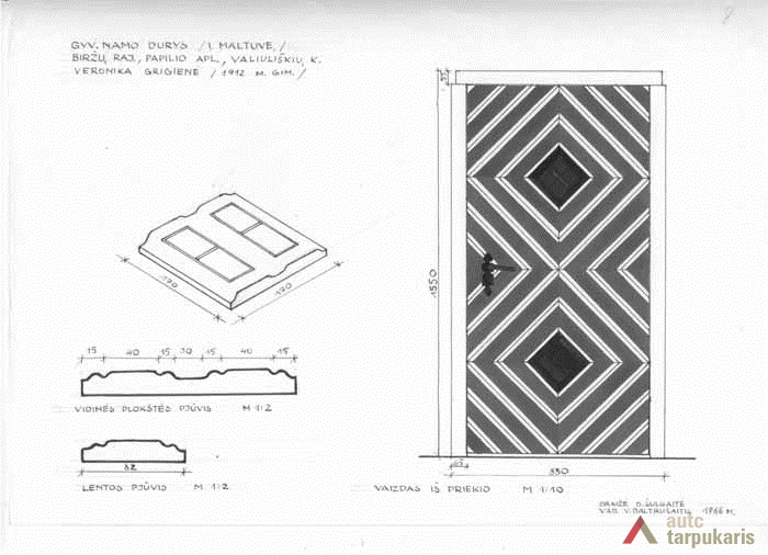 Gyvenamojo namo durys į „maltuvės“ patalpą. Vienvėrės, dvisluoksnės konstrukcijos: vienas sluoksnis sudarytas iš vertikalių lentų, kitias – iš keliomis kryptimis sukaltų profiliuotų lentelių. Plokštuma padalyta į aštuonias dalis taip, kad įstrižai sukaltos lenteles sukurtų simetrišką piešinį: du rombus viršutinėje ir apatinėje dalyje. Durys dažytos. Rankena puošni, kalvio darbo.