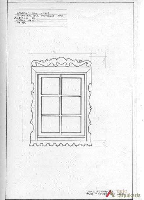 Gyvenamojo namo langas, šešių ručių. Langą puošia itin dailūs, dekoratyvūs apvadai. Viršutinė dalis – stilizuotu augalinių motyvų pjaustiniu padabintas antlangis. Apvadų šoninės dalys taip pat dekoruotos ritmingais pjaustiniais. Apatinė dalis papuošta smulkiais drožiniais, geometriniu ornamentu.