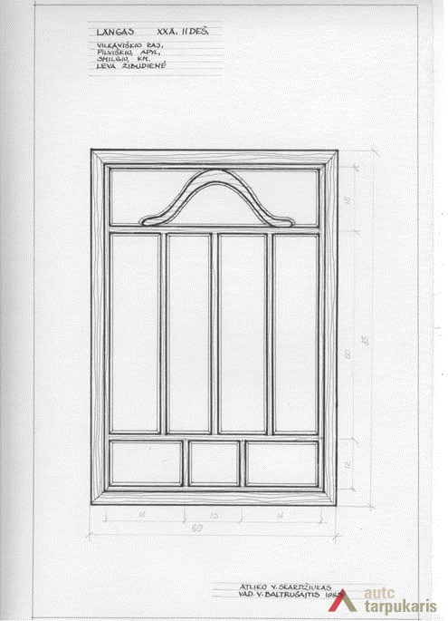 Gyvenamojo namo langas. Sudalytas į kelias simetriškas dalis. Viršutinėje dalyje lenktų linijų puošmena. Langas būdingas XX a. ketvirto dešimtmečio statybai.