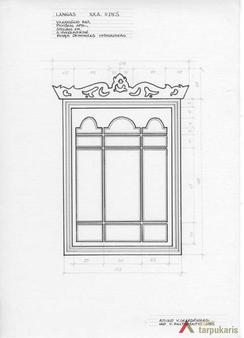 Gyvenamojo namo langas. Sudalytas į kelias simetriškas dalis. Apvadas virš lango padabintas lenktomis linijomis ir kiaurapjūviu ornamentu, kuris itin puošia langą. Langas būdingas XX a. ketvirto dešimtmečio statybai.