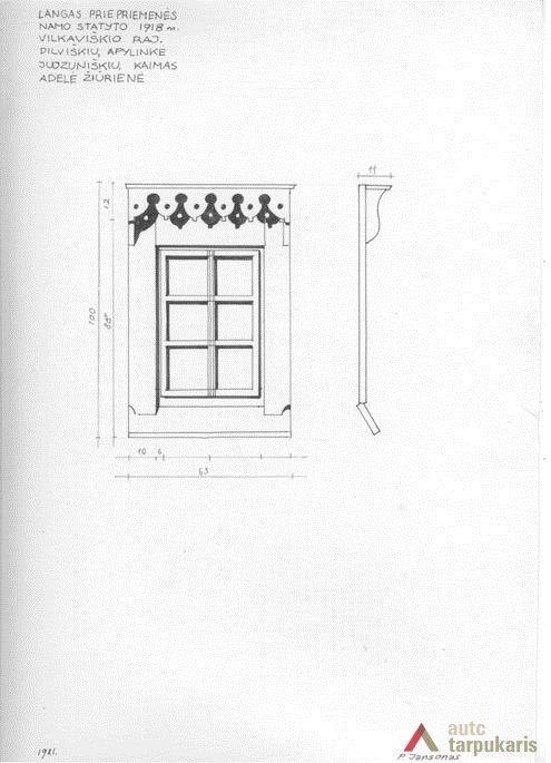Gyvenamojo namo, statyto 1918 m., langas. Šešiarūtis. Apvadai platūs, 10 cm pločio, apatinė dalis po langu pritvirtinta su nuolydžiu. Ypač puošnus antlangis – padabintas kiauraraščiu geometriniu ornamentu ir sudaro „nėriniuotą stogelį“ .