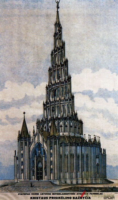 Tais pačiais metais paskelbto bažnyčios projekto konkurso nuotatai reikalavo, kad bažnyčia būtų „sulig autoriaus nuožiūra, bet pageidaujama, kad charakterizuotų Lietuvos dvasios ypatybes, sietųsi su jos garbinga praeitimi ir kova už nepriklausomybę, kad išorinė išvaizda savaime būtų tos kovos monumentas...“[3] Tiesa, vos suformavus idėją, atsirado nemažas būrys prieštaraujančių tiek dėl netinkamos urbanistinės vietos (susisiekimo su apatine miesto dalimi stoka), tiek dėl pačios bažnyčios idėjos: „Nepriklausomybės paminklas turi būti visos tautos paminklas, be tikybos, kalbos ir politinių pažiūrų skirtumo“[4]. Būta siūlymų bažnyčią pakeisti paminklu Nežinomam knygnešiui, muziejumi ir pan.[5]. Vis dėlto konkursas 1928 m. buvo paskelbtas. Iš gautų 15 projektų, trys darbai buvo premijuoti. Pirmoji premija skirta Jonui Krasauskui, antroji – Feliksui Vizbarui, o tečioji atiteko Karoliui Reisonui. Tačiau buvo nuspręsta, kad „nei vienas jų neatitiko paminklinės idėjos“ ir „pasitarus su kai kuriais specialistais architektoriais ir visuomenėje žymiais asmenimis“[6] bažnyčios statyba pavesta K. Reisonui, kuris konkursui patektą savo projektą gerokai perdirbo ir sukūrė įspūdingą gelžbetoninį 83 metrų aukščio sraigtinės piramidės tūrį, kurį turėjo vainikuoti milžiniška „7 metrų Kristaus Priskėlimo statula“[7]. Tikėta, kad statinys „suteiks Kaunui charakterį, kaip Eifelio bokštas Paryžiui“[8].