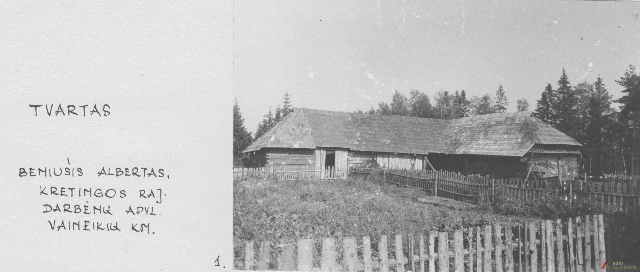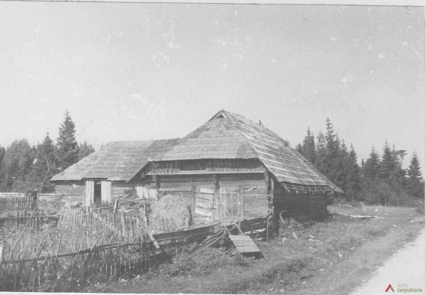 Tvartas L formos plano, suręstas iš tašytų rąstų, galuose suręstų į kertes. Stogas gegninės konstrukcijos, nevienalytis. Vienas stogo galas keturšlaitis su čiukuru, kitas – pusvalminis. Stogas dengtas malksnomis. Pastogės plačios, tinkamos sandėliuoti malkas ir rakandus. Tvarte daug patalpų, jų durys įvairios konstrukcijos. Ne itin būdingos dvejos durys iš tvarto galo; jos veda į dvi skirtingas patalpas. Kitame tvarto gale taip pat įrengtos atskiros durys. Tvartas – būtinas sodybos pastatas, kuriame buvo laikomi gyvuliai. Jis suręstas atokiau nuo gyvenamojo namo.